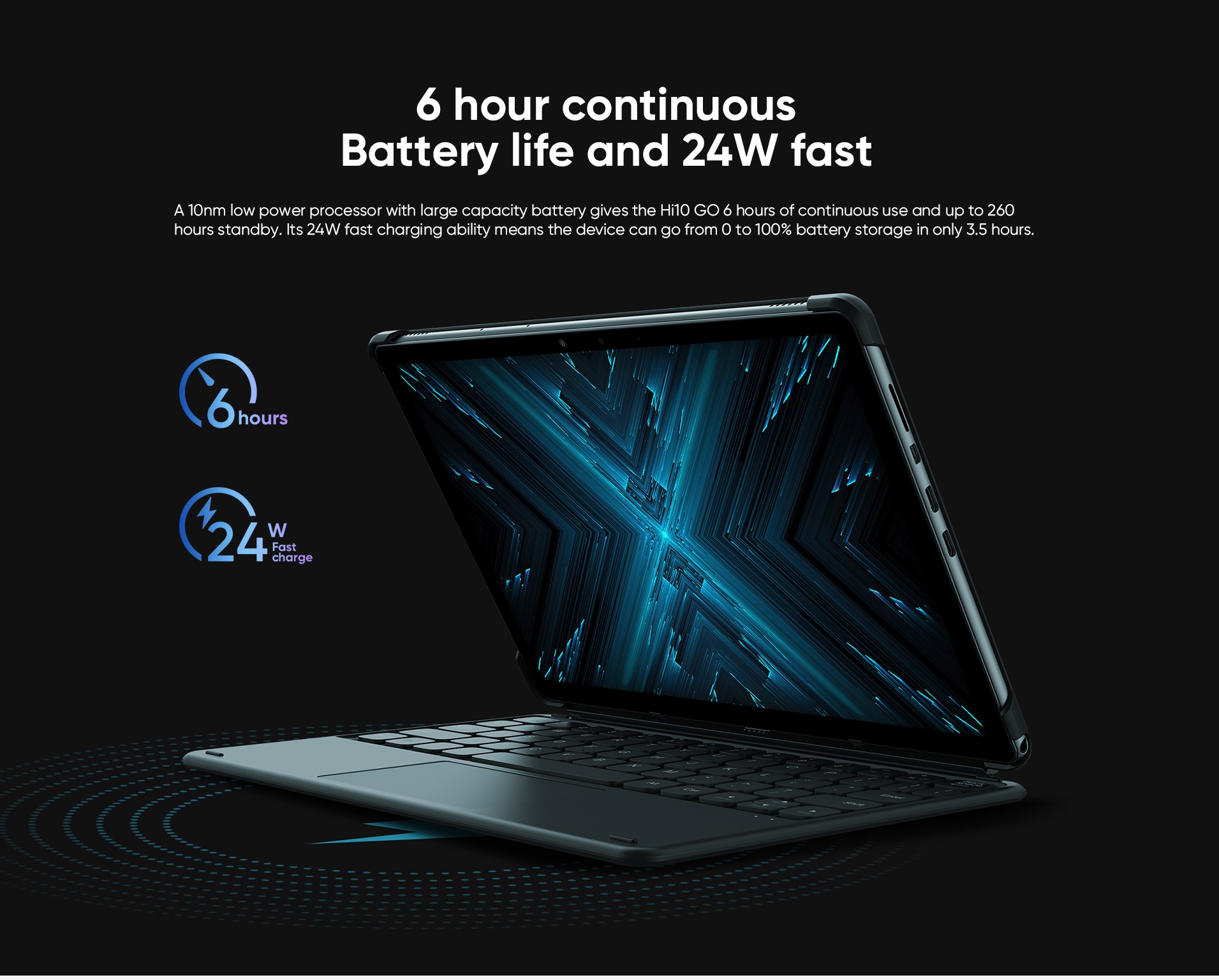 Thời lượng pin lê đến 6h làm việc giúp bạn làm việc gần như cả ngày mà không cần sạc. Chiếc Hi10 Go sử dụng công nghệ sạc nhanh 24W giúp bạn sạc đầy máy chỉ trong 3.5h.