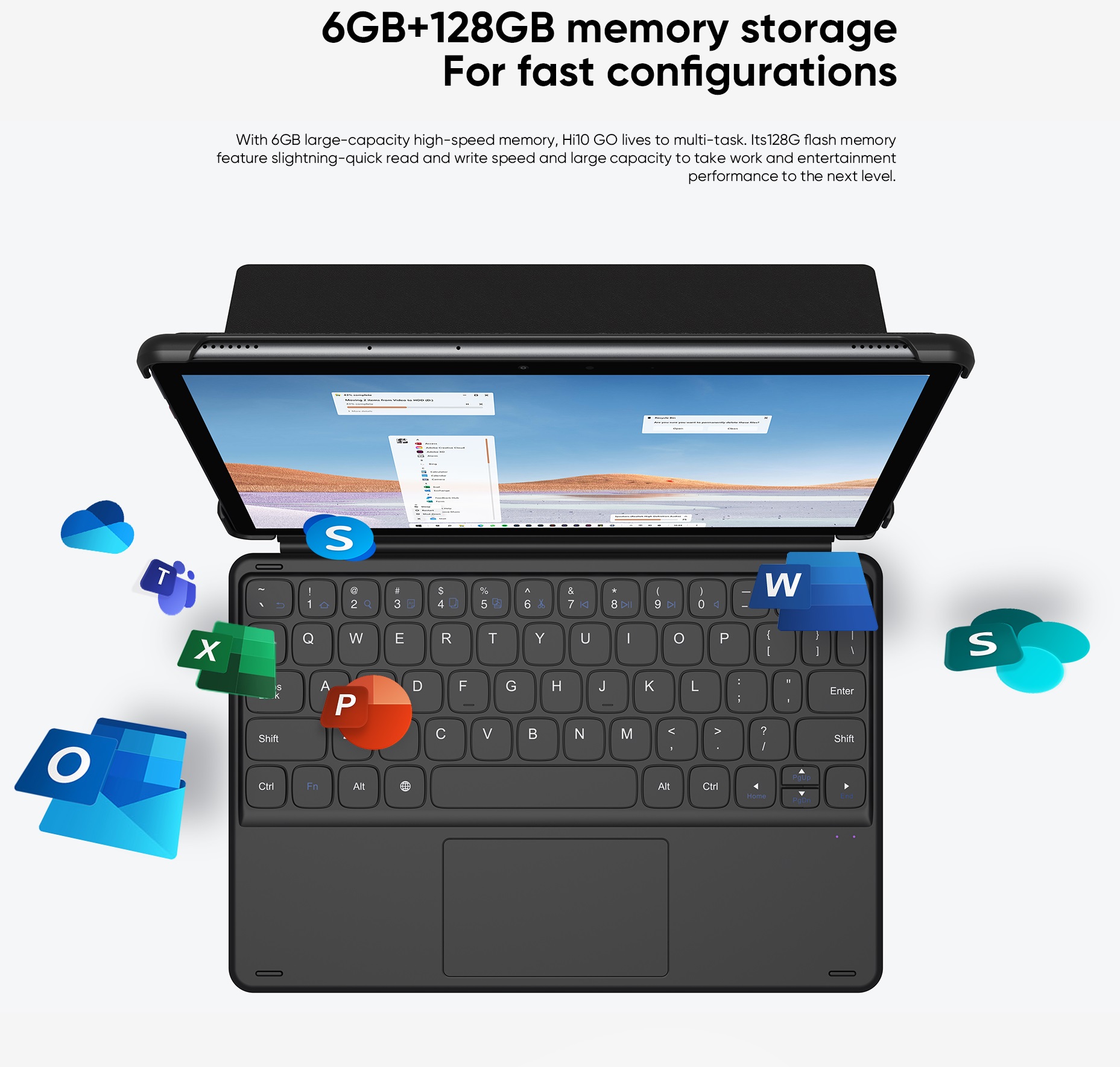 Với bộ nhớ ram 6GB giúp chiếc Chuwi Hi10 Go làm việc đa nhiệm khá tốt, với bộ nhớ 128GB EMMC có tốc độ đọc ghi nhanh giúp máy khởi động các ứng dụng nhanh hơn. Bạn cũng có thể mở rộng khả năng lưu chữ của máy bằng thẻ nhớ SD.