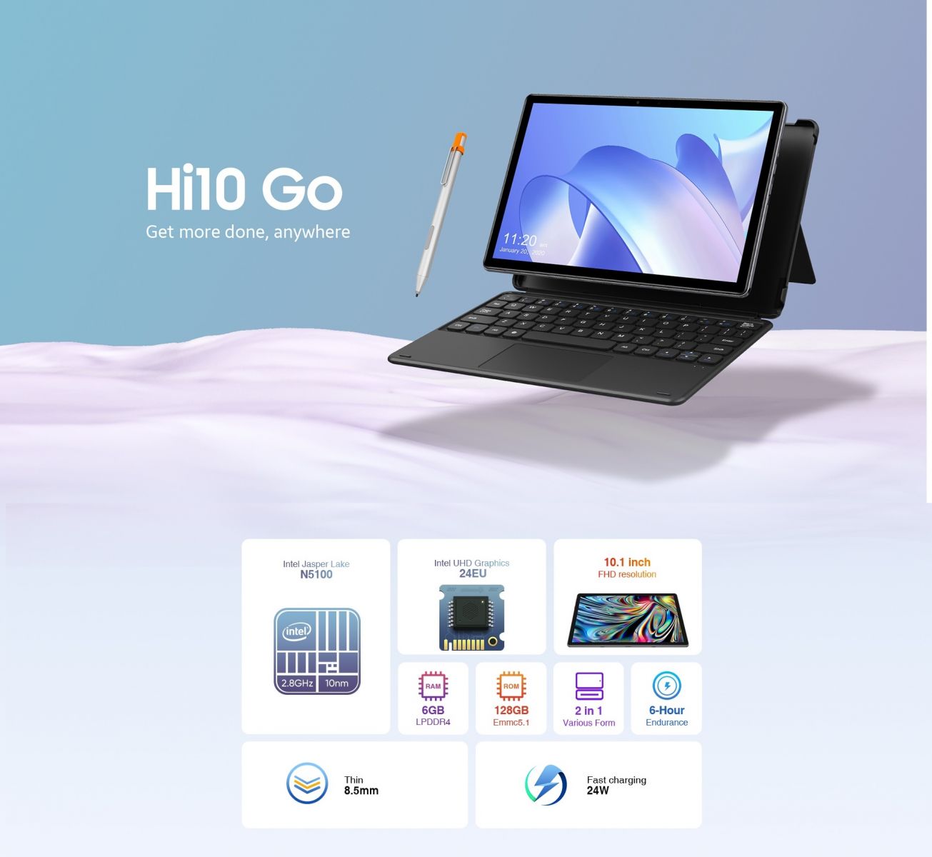 Sức mạnh của chiếc Hi10 Go đến từ con chip Intel Jasper lake N5100 được gia công trên tiến trình 10nm mới nhất của intel. Đây là chip dành cho máy tính bảng với mức tiệu thụ điện năng thấp vừa mới được intel giới thiệu trong tháng 1/2021. Con chip này có hiệu suất cao hơn 30% người tiền nhiệm.