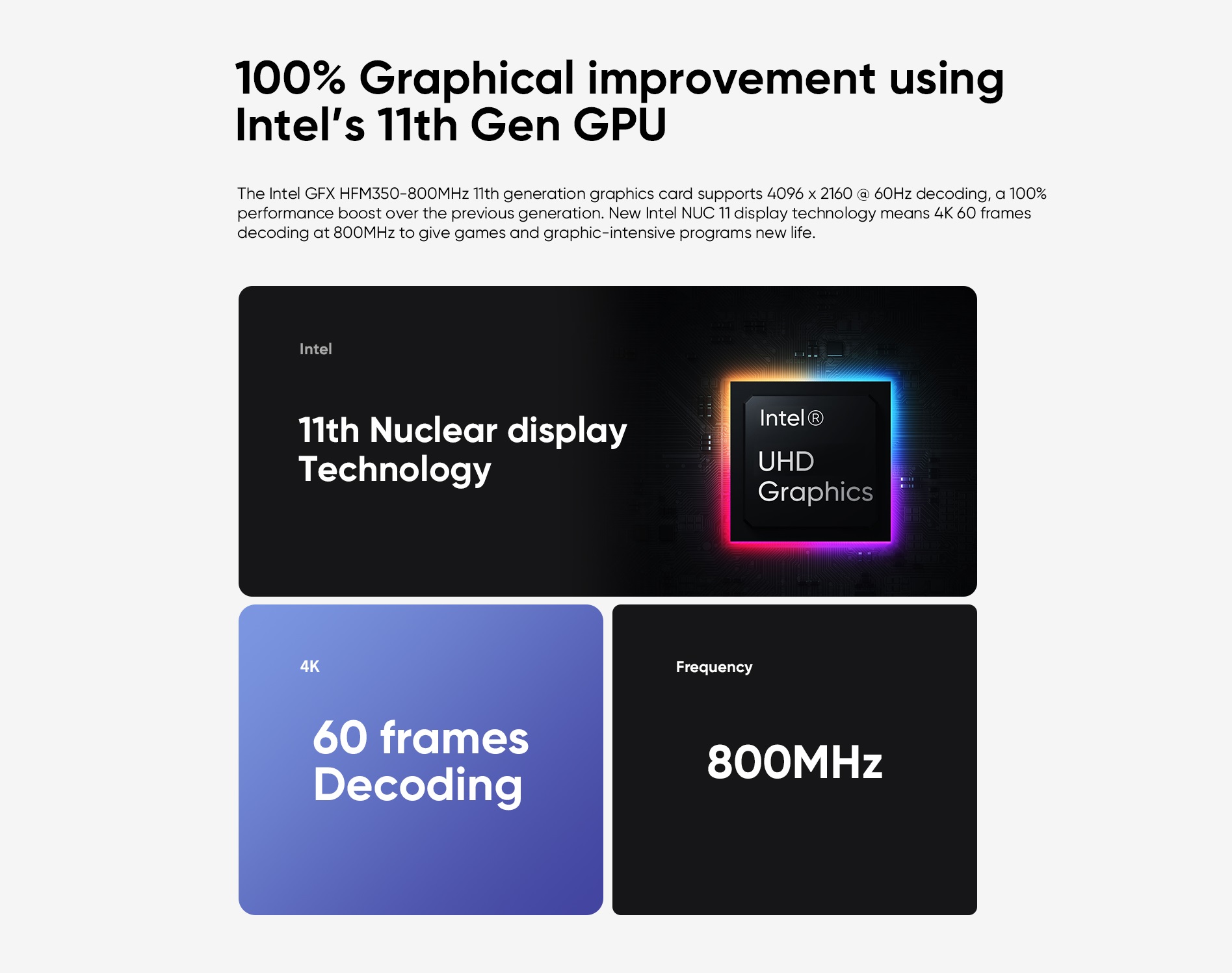 Card đồ họa Intel GFX HFM350-800MHz thế hệ thứ 11 hỗ trợ giải mã 4096 x 2160 @ 60Hz, tăng hiệu suất 99% so với thế hệ trước. Đồ họa GPU thế hệ thứ 11 mới của Intel hỗ trợ giải mã video 4K 60 khung hình ở 800MHz.