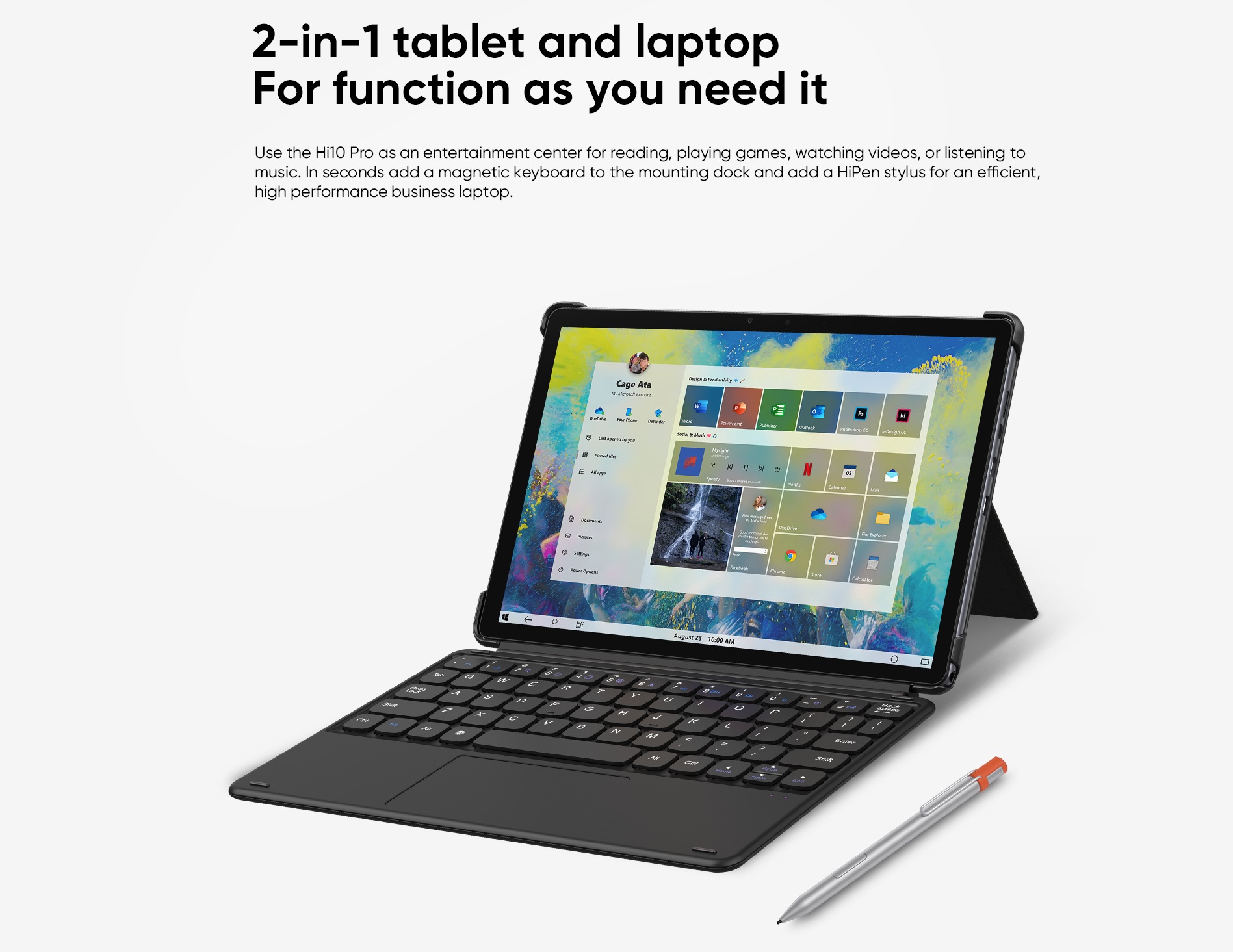 Là một chiếc máy tính được thiết kế để đáp ứng nhu cầu giải trí và công việc, nên chiếc Hi10 Go có thể dễ ràng biến thanh một máy tính bảng ngọn nhẹ hay thành một chiếc laptop thực thụ chỉ với một thao tác. Khi cần làm việc bạn chỉ đơn giản lắp bàn phím vào và bạn có thể thoải mái làm việc như trên một chiếc laptop. Chiếc Hi10 Go cũng hỗ trợ bút cảm ứng Hipen với mức nhận lực lên đến 4096. Bạn có thể viết, vẽ hay nghi chú với chiếc hipen mà không thấy có sự khác biệt với việc sử dụng bút viết trên giấy.