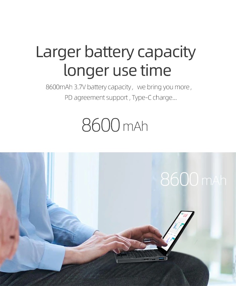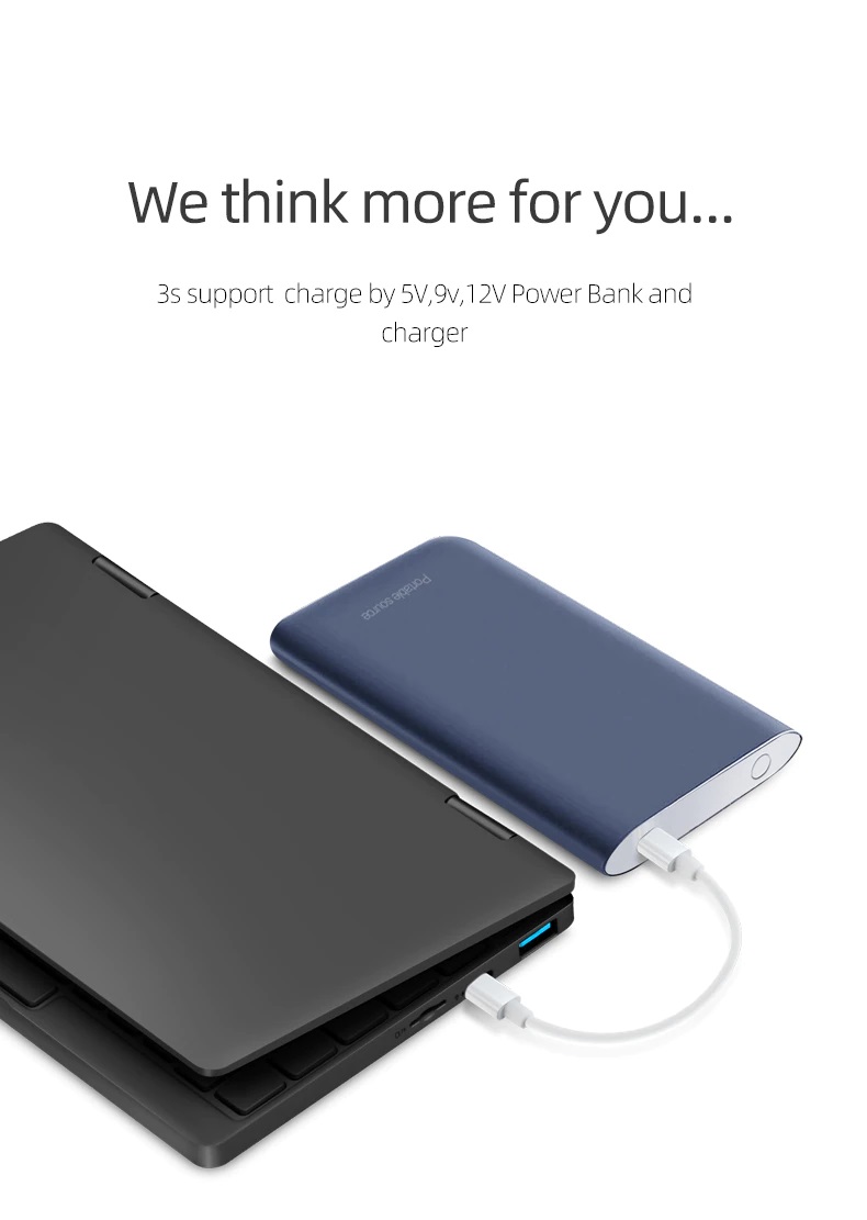 Ngoài cấu hình thì chiếc One Mix 3S có thời lượng pin lên đến 7-10h, với thời lượng pin như vậy bạn có thể là việc cả ngày mà không cần sạc. đặc điểm này cực kỳ phù hợp với kỹ thuật viên IT và nhân viên kinh doanh bởi đặc đểm công việc luôn phải di chuyển. Vì là thiết kế siêu di động lên chiếc laptop mini của one netbook hỗ trợ 3 chế độ sạc gồm 5V, 9V và 12V do đó nếu cần bạn có thể dung sạc dự phòng để sạc cho máy tính của mình.