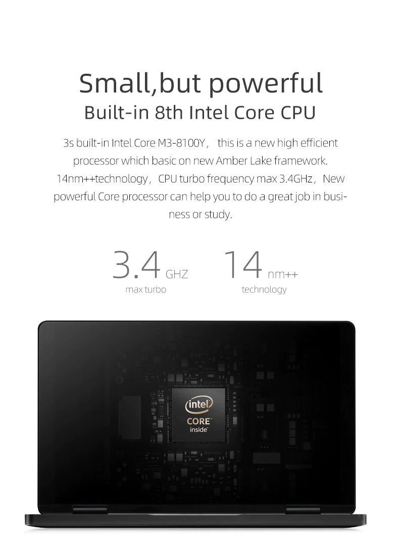 Chiếc laptop mini One mix 3S của One netBook rất độc đáo với thiết kế siêu nhỏ gọn nhưng sức mạnh của nó lại không như vẻ ngoài của mình. Được trang bị chip Intel Core M3-8100Y hai lõ bốn luồng Tần số Turbo tối đa lên đến 3.40GHz. Hỗ trợ chip core M3-8100Y là thanh ram 8GB/16GB ổ cứng 256GB/512GB NVMe siêu nhanh, ổ cứng nhan kết hợp với ram lớn giúp chiếc One mix 3S có thể dễ dàng sử lý các tác vụ nặng hay là việc đa nhiệm.
