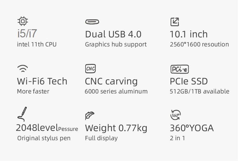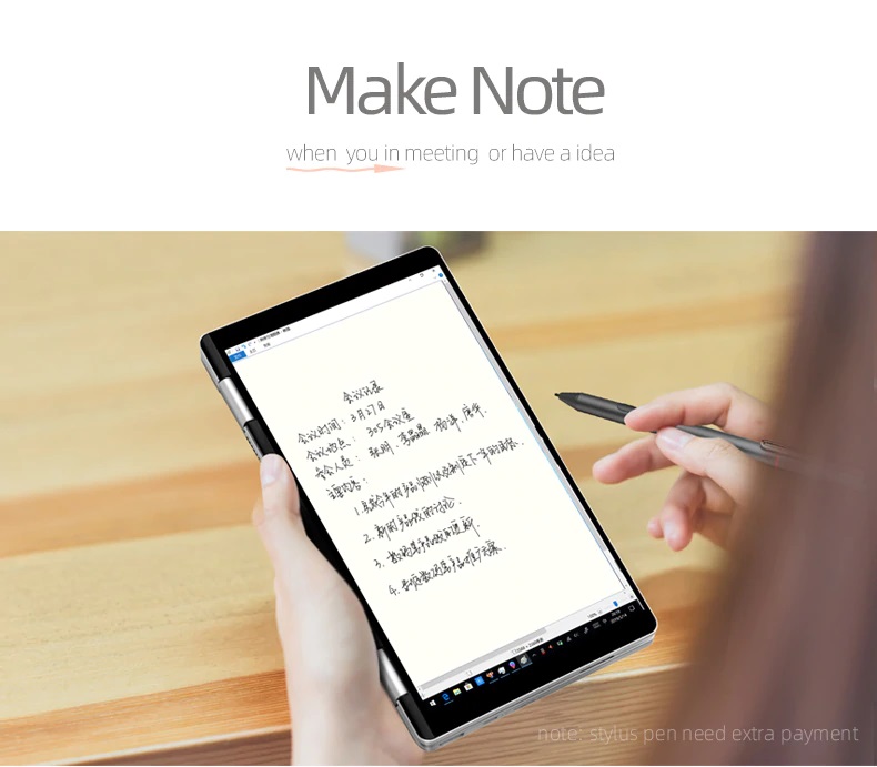Màn hình 10.i inch của chiếc one onemix 4 có độ phân giải 2.5K (2560*1600) với màn hình chiếm 90% diện tích máy. ngoài ra thiết kế màn màn hình có thể xoay gập 360 độ giúp bạn dễ dàng biến chiếc laptop thày một máy tính bảng nhỏ gọn trên tay.