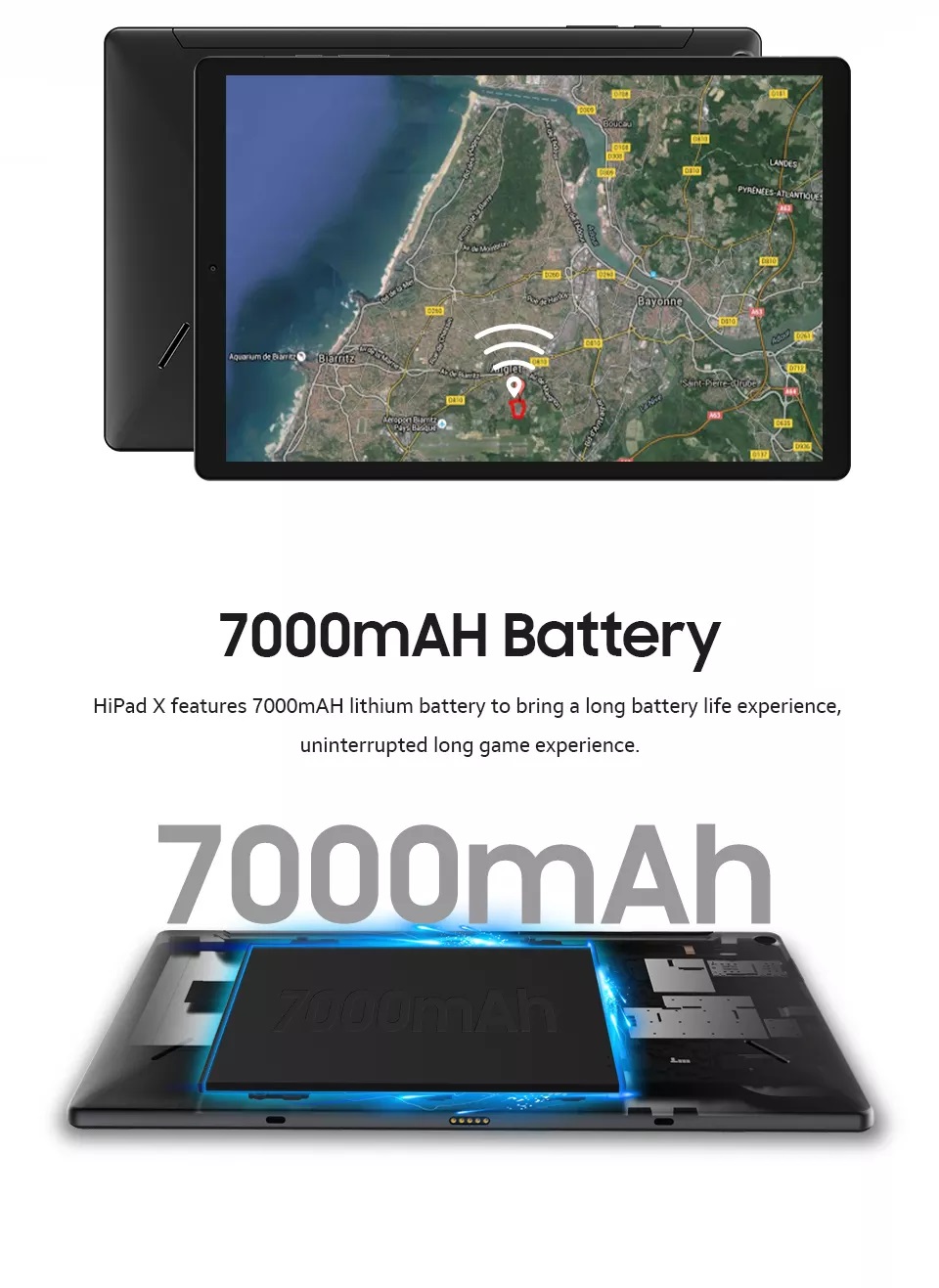 HiPad X trang bị pin lithium 7000mAH giúp máy có thời lượng pin rất dài, bạn có thể thoải mái chơi game với chiếc tablet của mình.