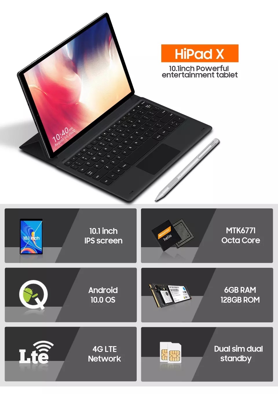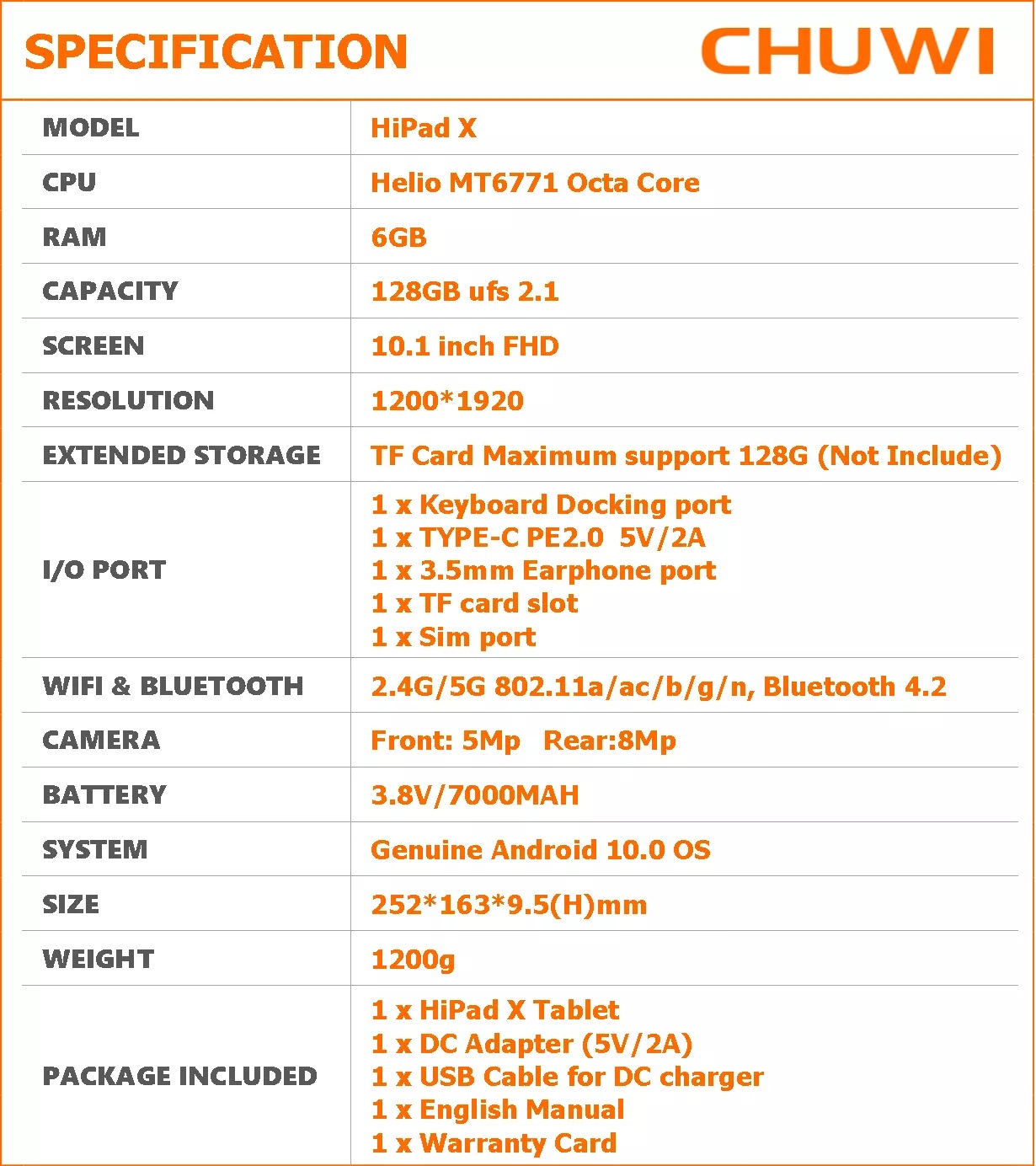 Sau khi dừng sản xuất chiếc máy tính bảng Chuwi HiPad LTE chỉ vài tháng sau khi ra mắt, hãng đã tiếp tục giới thiệu phiên bản nâng cấp là chiếc HiPad X. Chiếc HiPad X với thiết kế ngoại hình tương tự người tiền nhiệm nhưng phần cứng có một chút khác biệt nhiều nhưng chiếc HiPad X sử dụng chip Heilo MT6771V chứa bốn nhân A73 và A53, nó cũng được tích hợp ram 6GB và ổ cứng 128GB UFS nhanh nhanh hơn ổ EMMC thông dụng.