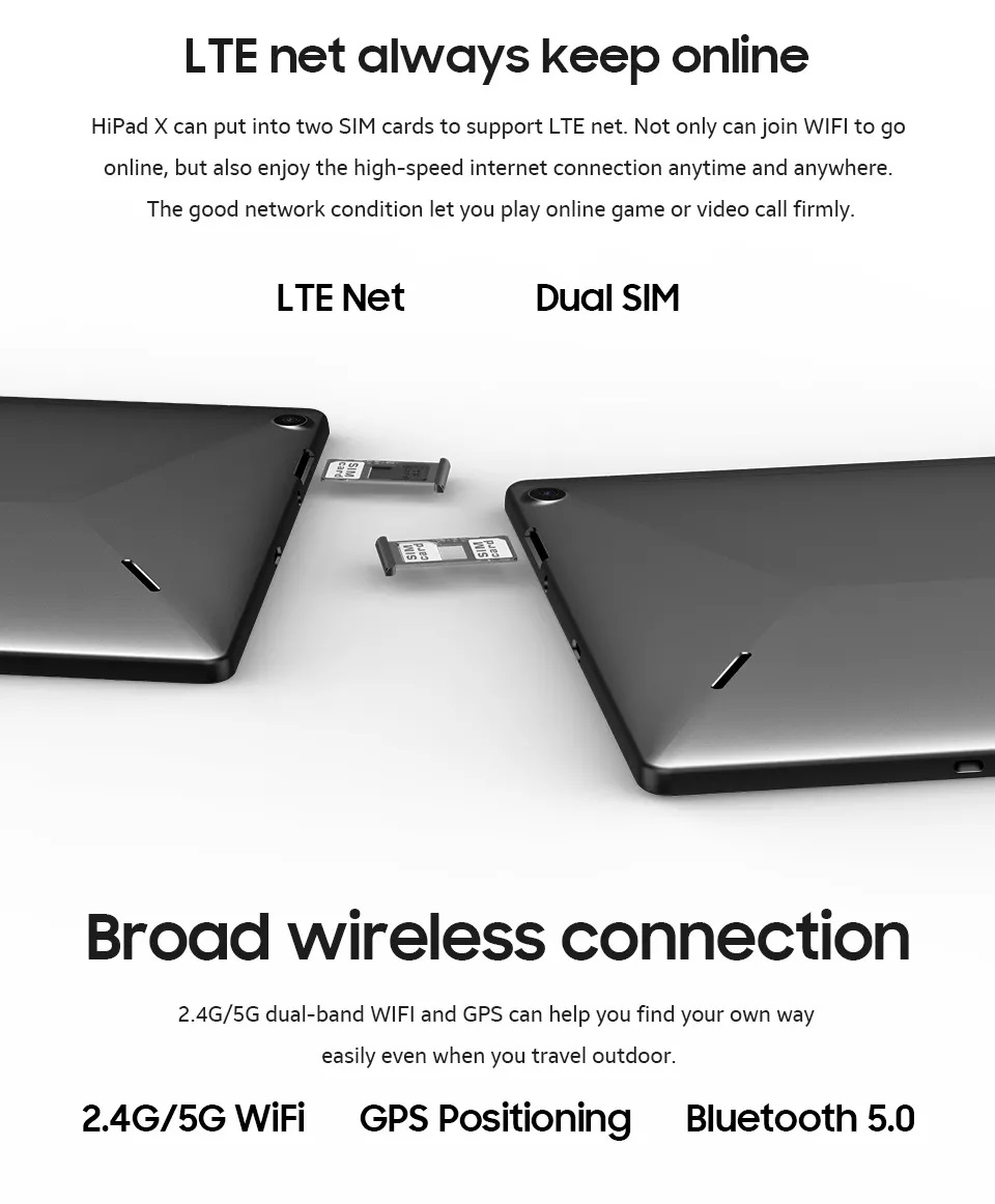 Ngoài khả ngăn kết nối wifi băng tần kép 2.4G / 5G và GPS thì chuwi Hipad X còn hỗ trợ 2 sim để bạn có thể thoải mái kế nối mạng 4G LTE.