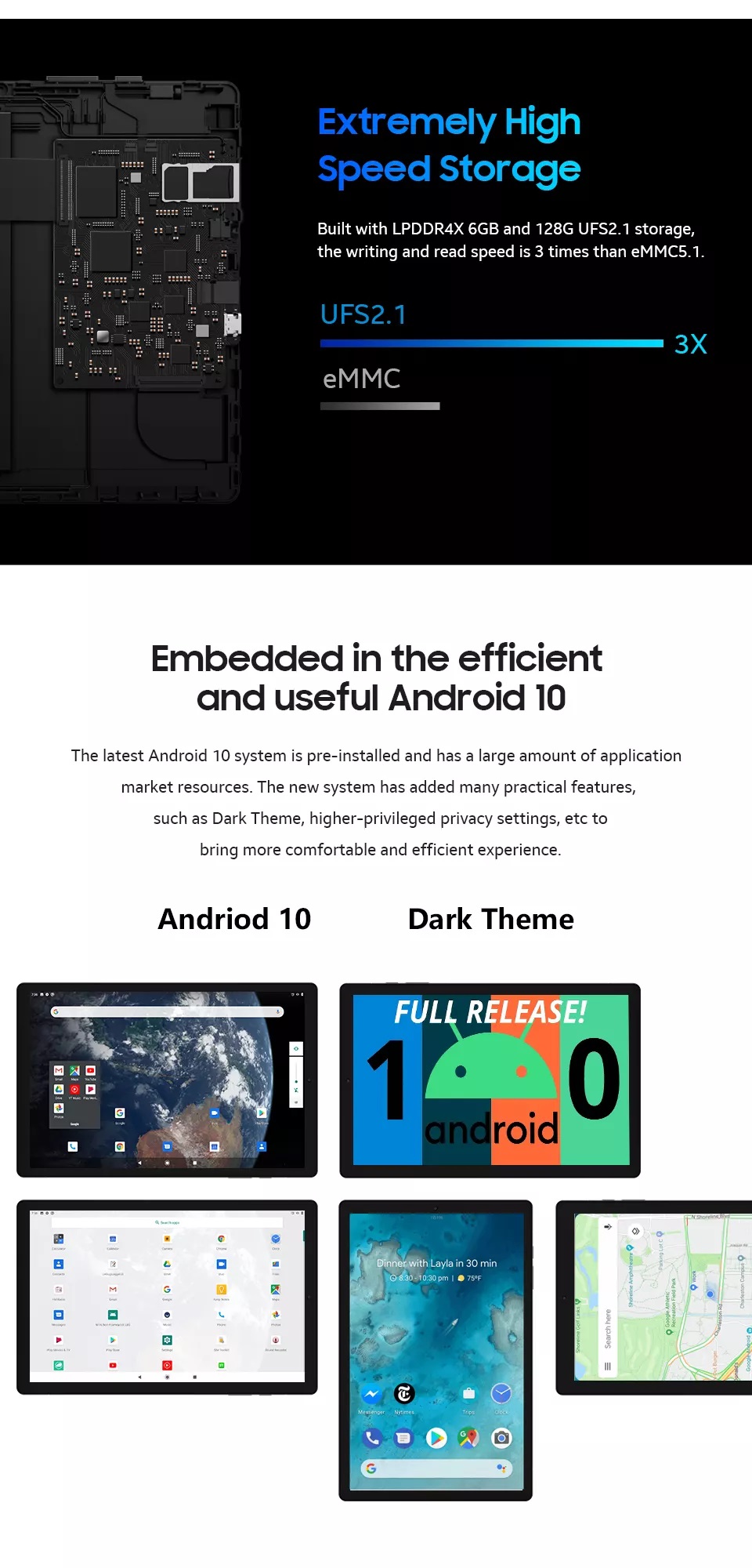 Chuwi HiPad X trang bị bộ vi xử lý 8 nhân Heilo MT6771V chứa bốn nhân A73 và A53 và GPU Mali G72, hỗ trợ chơi game di động phổ thông cũng như giải trí và xem phim. Bộ nhớ 6GB LPDDR4X và bộ nhớ flash UFS 128GB có thể giúp chạy đa nhiệm hiệu quả và mượt mà. Bộ nhớ UFS cung cấp trải nghiệm cực kỳ nhanh chóng cho việc sử dụng hàng ngày, nhanh gấp 3 lần so với eMMC và tải nhanh hơn khi chơi các trò chơi lớn.
