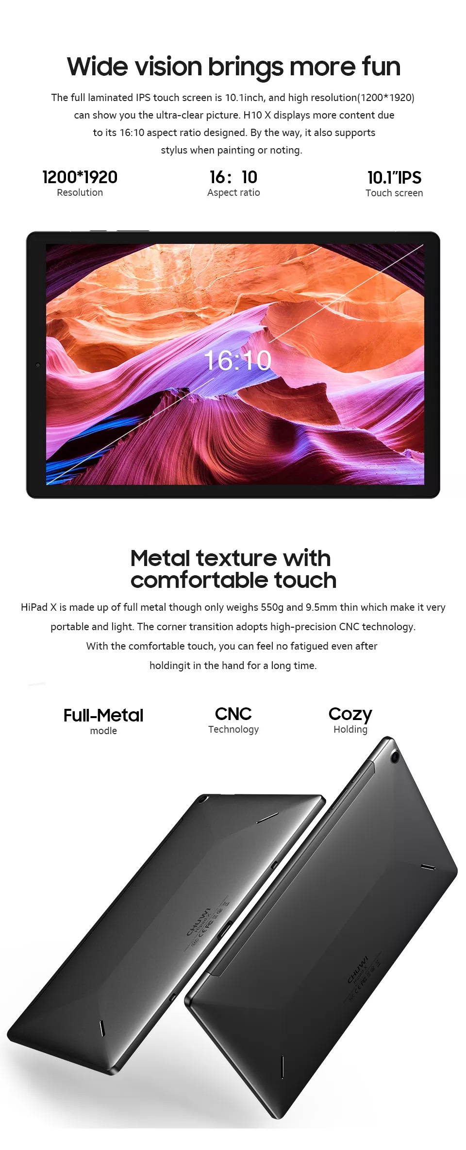 Chuwi HiPad X được thiết kế vỏ máy hoàn toàn bằng kim loại với màn hình IPS 10.1 inch 1200*1920 tỷ lệ khung hình 16:10  năng 550 gram và dày 9,5 mm. Cũng theo su hướng đa nhiệm như chiếc Samsung Galaxy Tab S7 / Tab S7+ hay iPad 2020 chiếc tablet chuwi hỗ trợ mở rộng với bàn phím vật lý và bút cảm ứng. Chính đều này làm tăng đáng kể khả năng sử lý công việc của thiết bị android thay vì chỉ mang tính giải trí như hiện nay