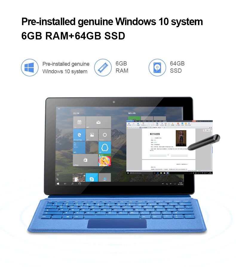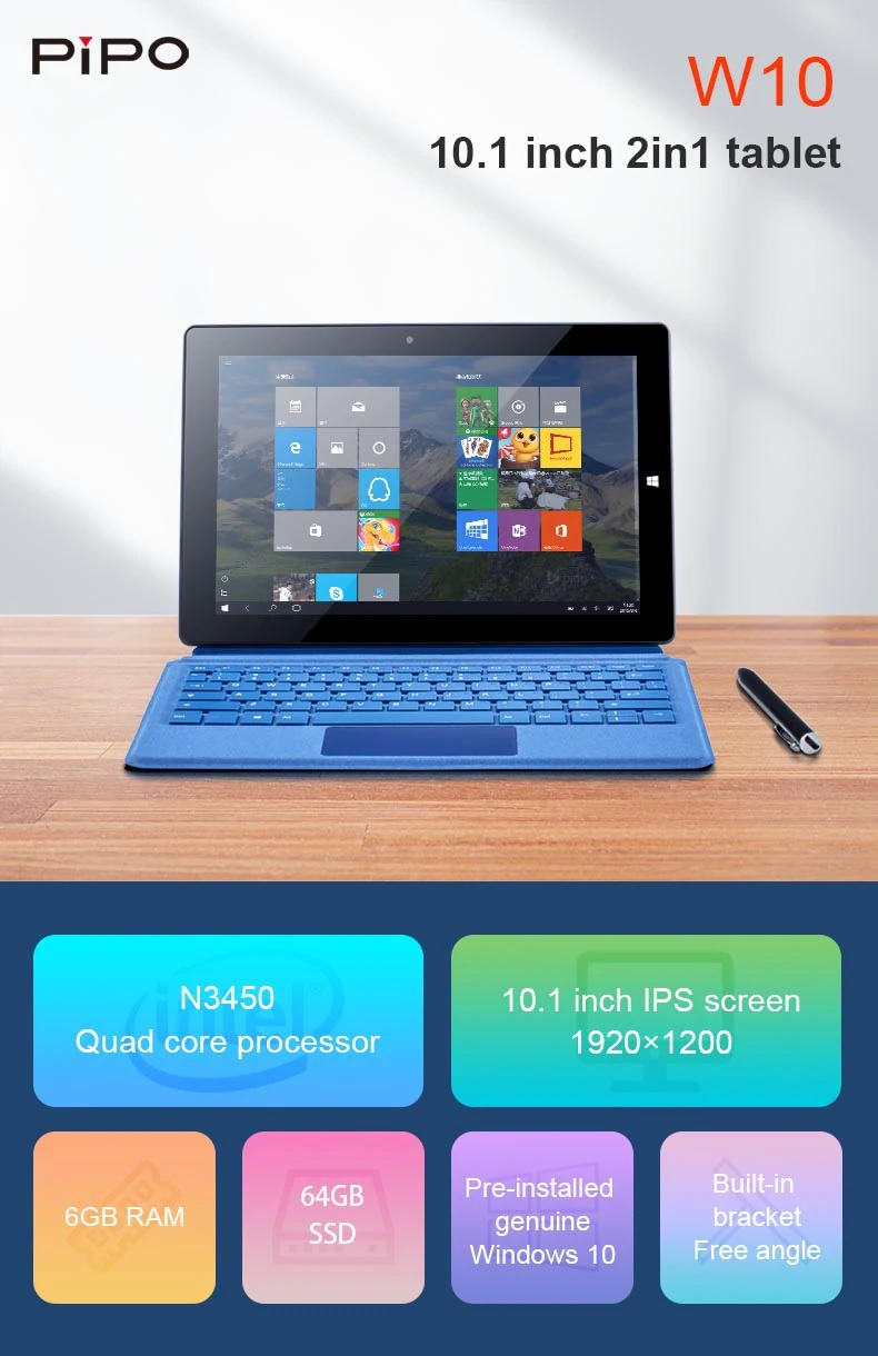 Máy tính bảng Pipo W10 được trang bị chip Intel Apollo Lake N3450 đi kèm thanh Ram 6GB ô cứng 64GB EMMC màn hình IPS 10.1 inch độ phân giải 1920*1200. cấu hình gần tương đương chiếc máy tính Jumper Ezpad Go M.