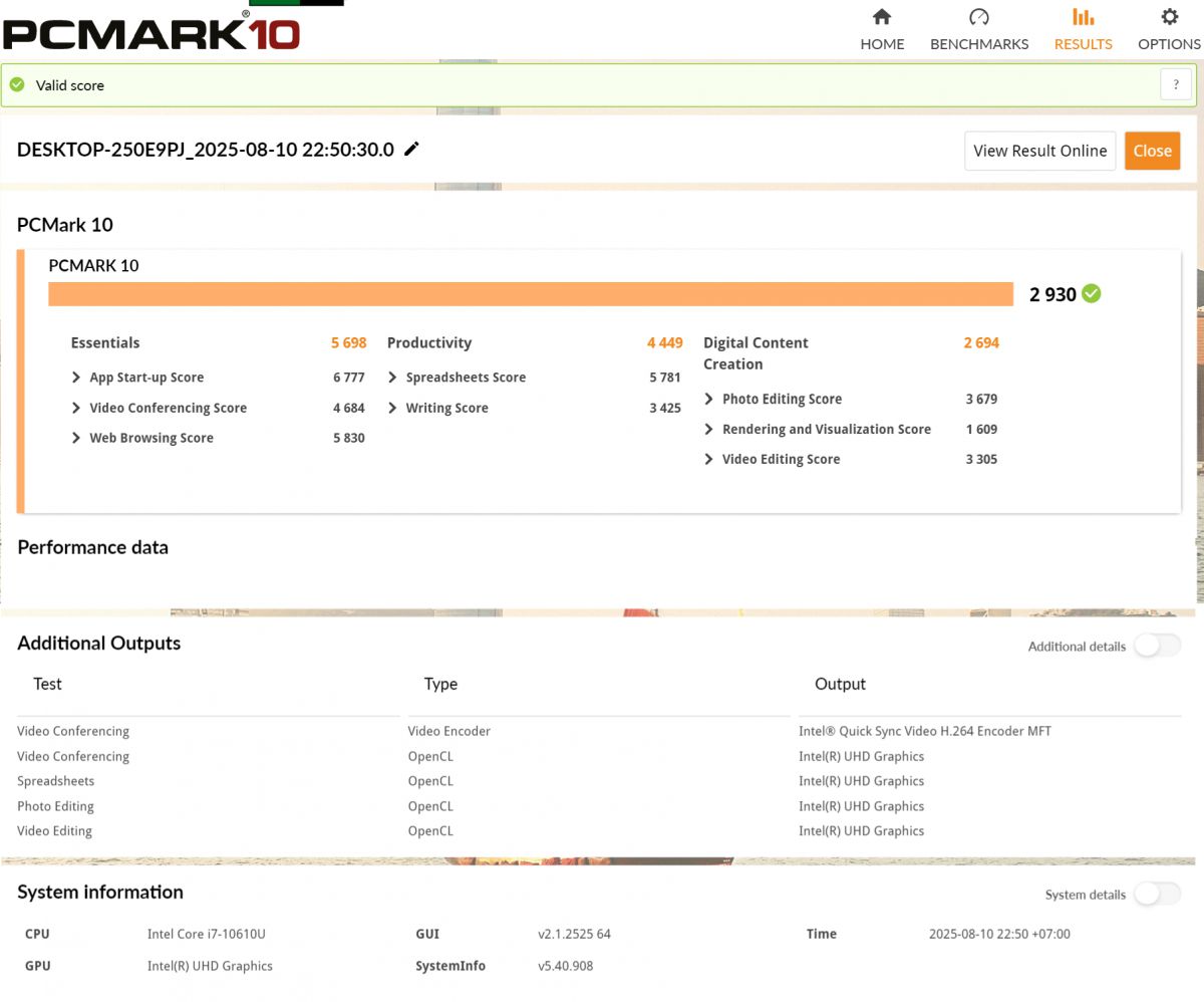Điểm tổng: 2 930 – đạt mức trung bình, máy phù hợp cho công việc văn phòng, học tập, chỉnh sửa ảnh/video nhẹ.