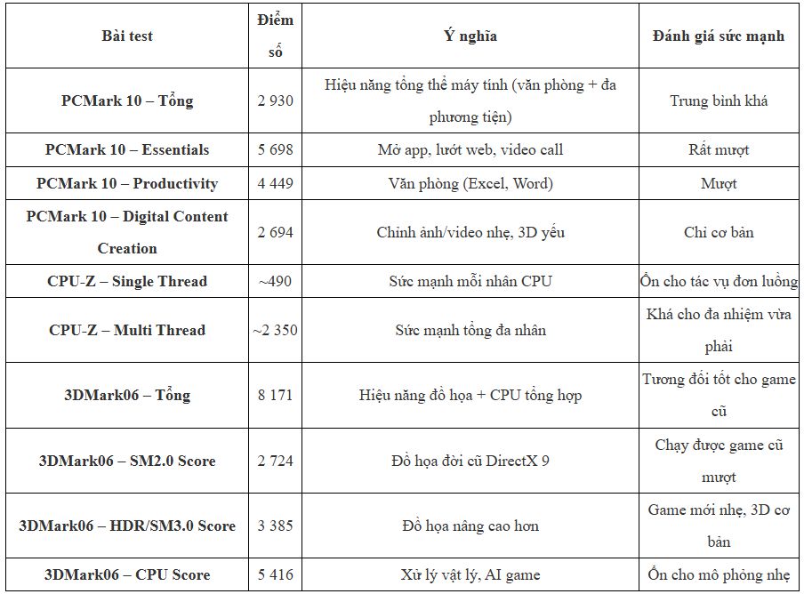 Tổng điểm này cho thấy máy bạn đủ chạy game cũ hoặc 3D nhẹ, nhưng GPU tích hợp hạn chế nên game mới sẽ không mượt.