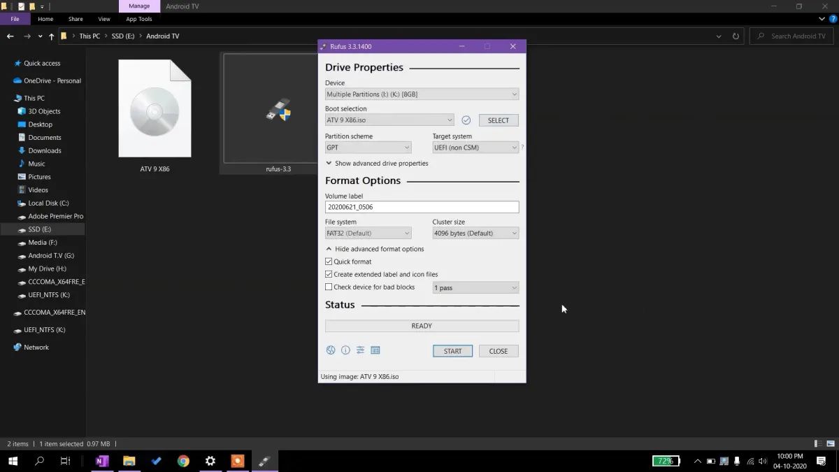 Sau khi tải Rufus về máy bạn cắm usb đã chuẩn bị vào máy tính của bạn rồi khới động ứng dụng rufus. trọng mục "Device" chỉ vào ổ USB của bạn. mục "Boot selection" chọn file iso android TV bạn tải về ở trước trước, các mục còn lại trọn như hình dưới rồi nhất start. Sau khi quá trình tạo ổ đĩa khởi động hoàn tất, hãy khởi động lại hệ thống.