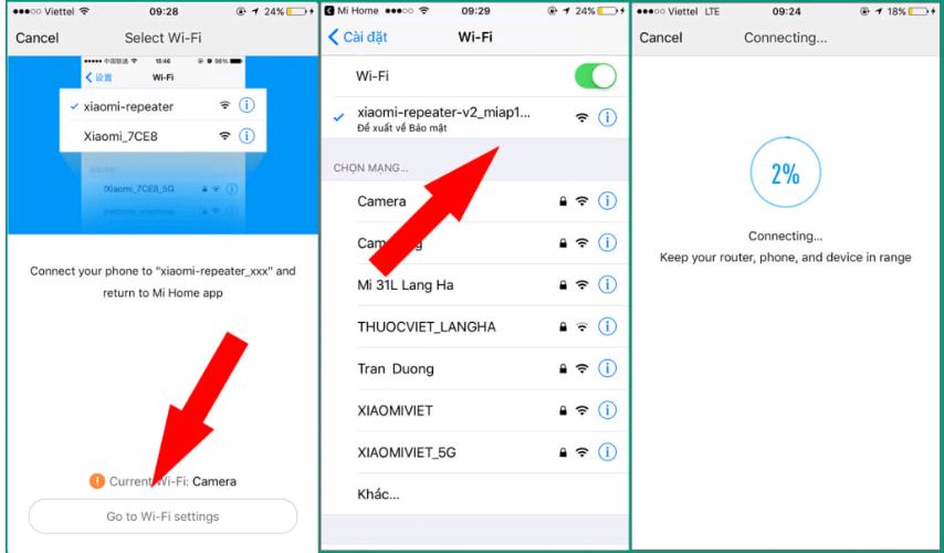 Bước 6: Nhấn vào Go to Wi-fi settings (lưu ý điện thoại phải đang kết nối với mạng Wifi cần kích). Danh sách các mạng wifi sẽ hiện ra, chọn kết nối với wifi mà Xiaomi WiFi Repeater Pro phát ra rồi vào lại ứng dụng Mi Home để hoàn tất việc cài đặt.