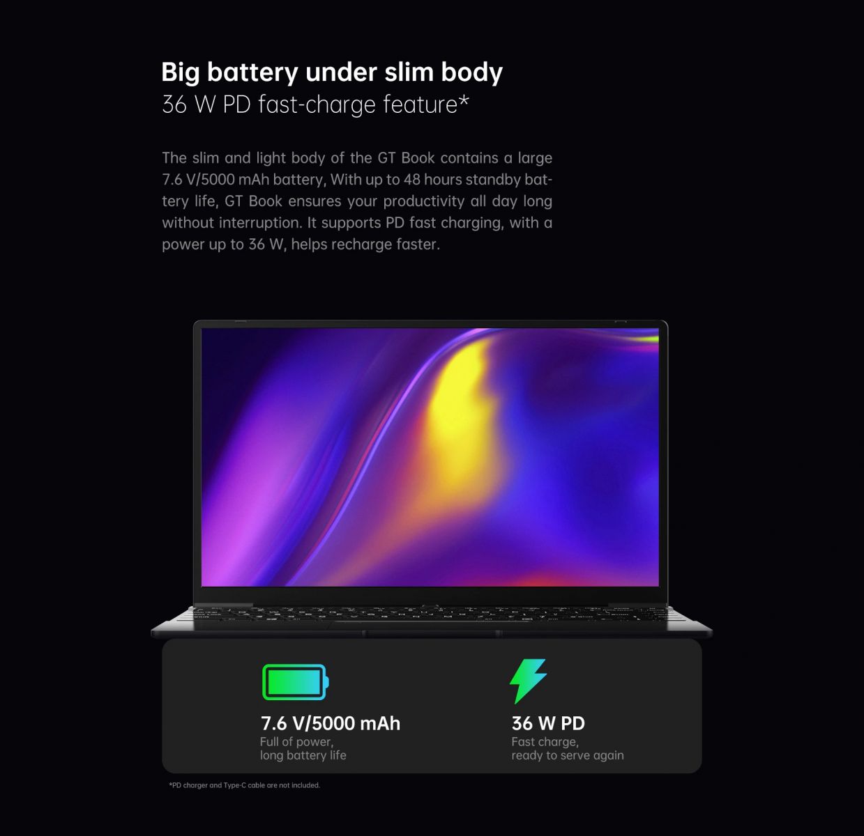 Chiếc laptop GT book được trang bị viên pin 10000mAh và hỗ trợ sạc nhanh 36W giúp người dùng không phải bận tâm đến thời lượng pin khi làm việc bên ngoài