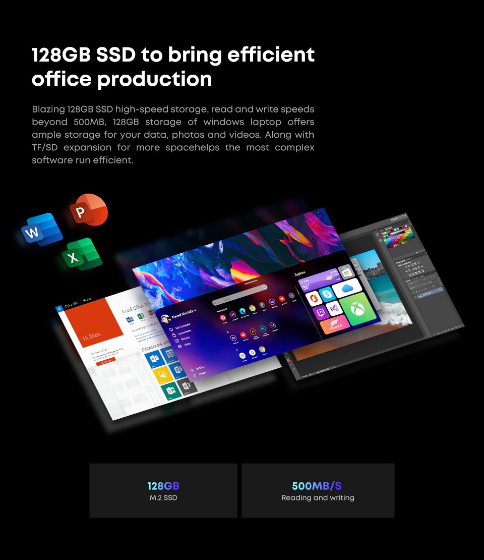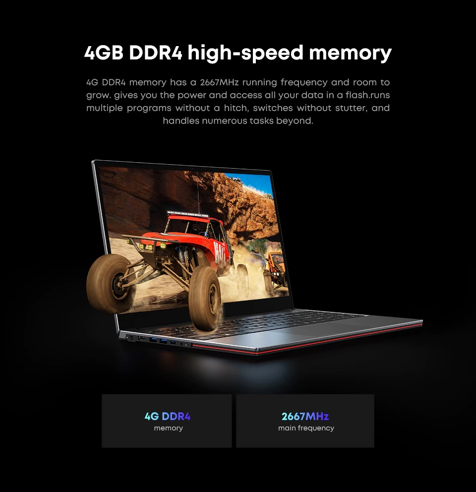 RAM: DDR4 4GB ROM: 128GB SSD Thẻ TF Mở Rộng Lưu Trữ: lên đến 128GB (Không Bao Gồm) SSD Mở Rộng Lưu Trữ: Max. 1TB (Không bao gồm) Về Lưu Trữ: thực tế có lưu trữ nội bộ có thể khác nhau tùy thuộc vào phần mềm cấu hình của bạn laptop.  |