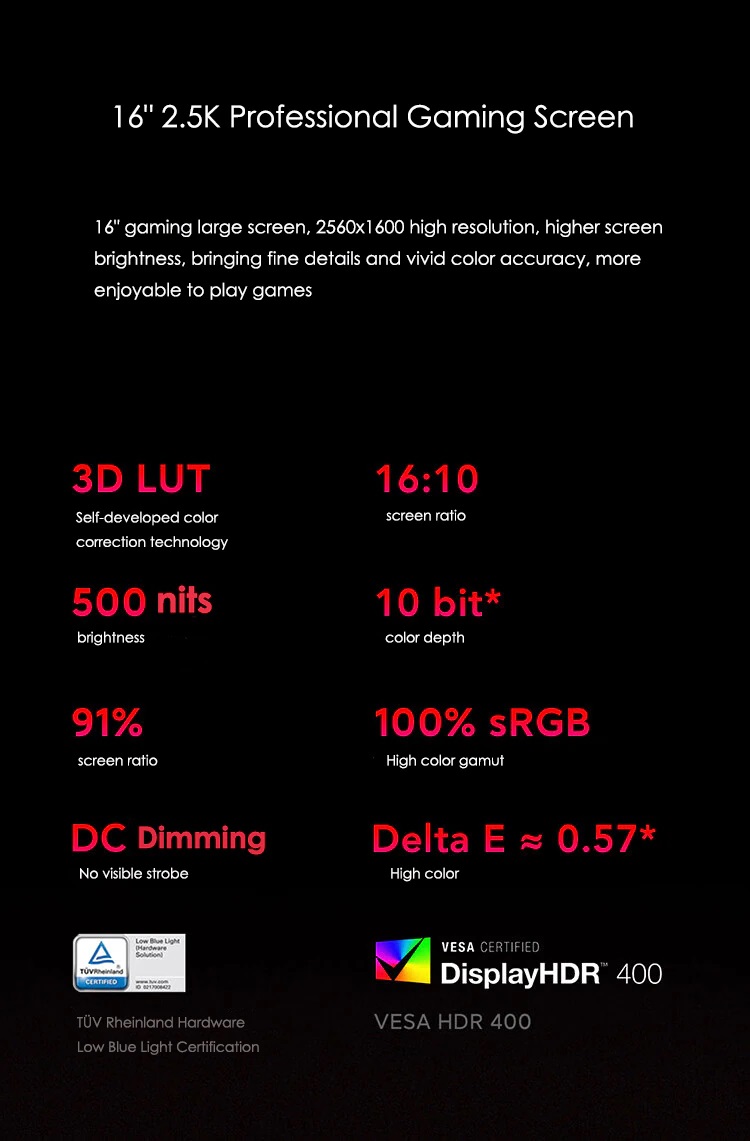 | Màn hình | Toàn màn hình LCD 16", độ phân giải 2560x1600; tốc độ làm mới cao 240Hz, hỗ trợ công nghệ làm mới thích ứng NVIDIA G-Sync; 100% sRGB (điển hình), Delta E ≈ 0,57 ; tỷ lệ tương phản 1200:1, độ sáng 500 nits;tỷ lệ màn hình so với thân máy là 91%, góc nhìn rộng 178°, công nghệ hiệu chỉnh màu 3D LUT tự phát triển, công nghệ làm mờ DC toàn cầu, hỗ trợ VESA HDR 400;Chứng nhận ánh sáng xanh dương thấp cho phần cứng TÜV Rheinland |