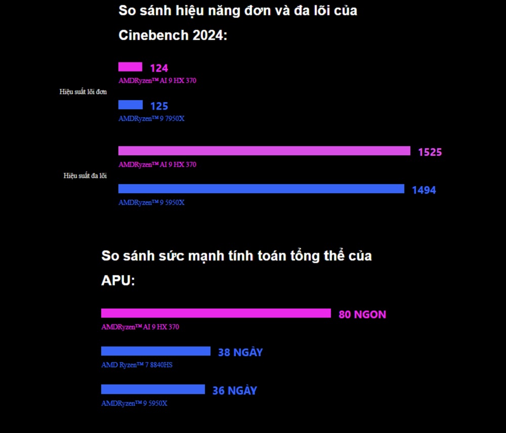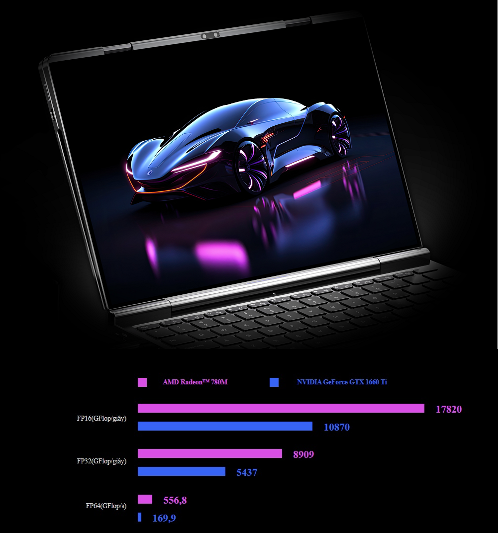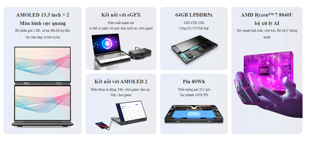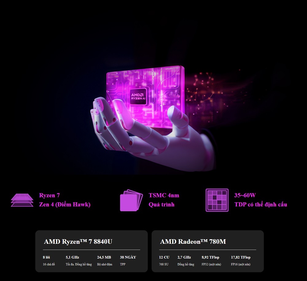 | Bộ xử lý | AMD Ryzen 7 8840U 8 x Zen 4 lõi CPU / 16 luồng (lên tới 5,1 GHz) Radeon 780M iGPU (12 x RDNA 3 lõi) XDNA NPU (hiệu suất AI lên tới 16 TOPS) TDP 35W (mặc định) 60W TDP (tối đa) |