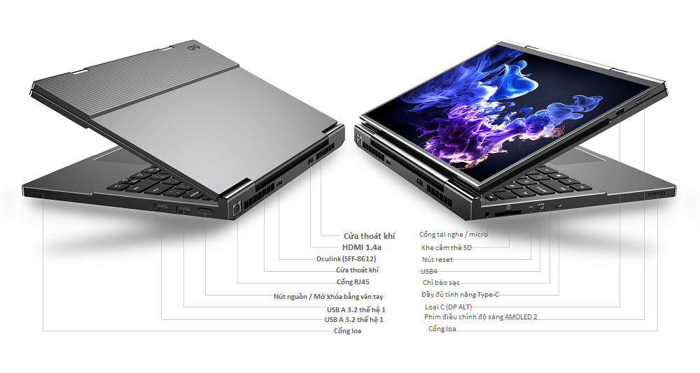 | Cổng | 1 x OCuLink (64 Gbps) 1 x USB4 (40 Gbps với Chế độ thay thế DisplayPort 2.1 và Cấp nguồn USB 100W) 1 x USB 3.2 Gen 2 Type-C (10 Gbps với Chế độ thay thế DisplayPort 1.4 và 100W USB-PD) 2 x USB 3.2 Gen 1 Type-A (5 Gbps) 1 x đầu vào video USB-C (cho màn hình thứ hai) 1 x HDMI 1.4a 1 x 2,5 GbE Ethernet 1 x giắc âm thanh 3,5 mm 1 x đầu đọc thẻ SD |