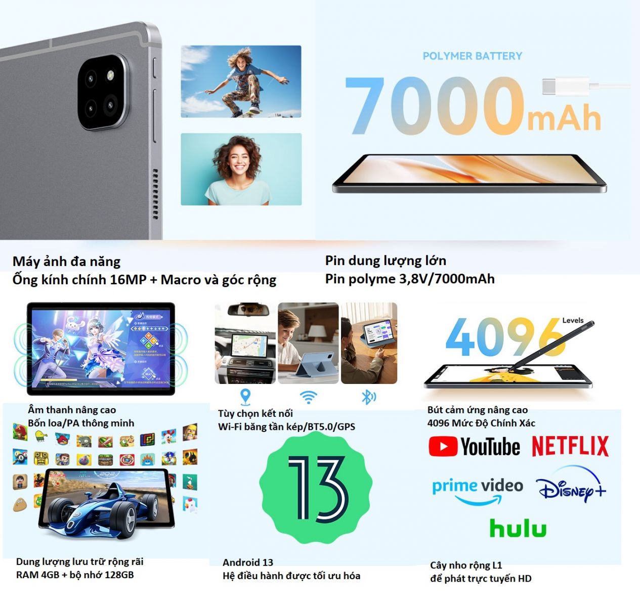 Màn hình FHD 11 inch | Widevine L1 (Netflix) | Thiết lập camera ba phía sau | 4096 Mức Độ Chính Xác