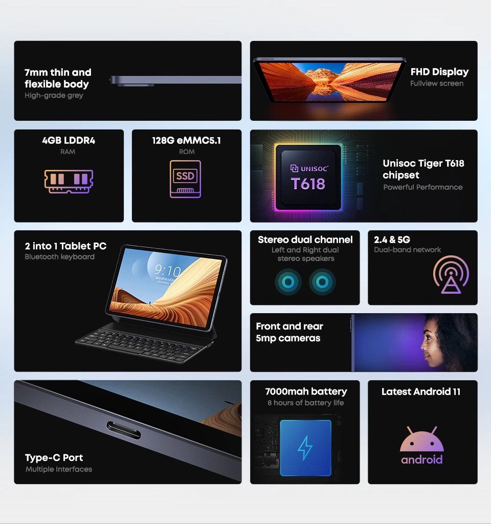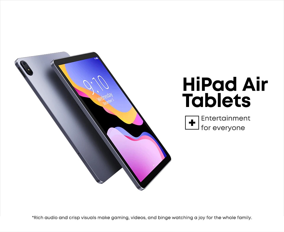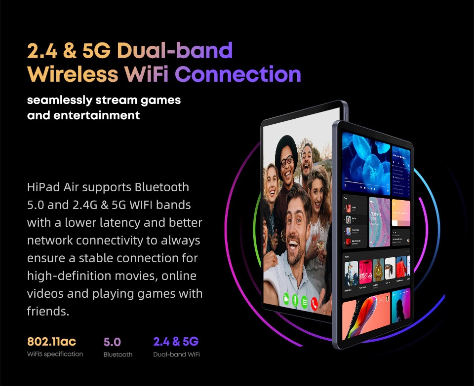 HiPad Air hỗ trợ WIFI băng tần kép 2.4G & 5G  và Bluetooth 5.0. Với độ trễ thấp và khả năng kết nối mạng tốt hơn luôn đảm bảo kết nối ổn định để tải các bộ phim độ nét cao, xem video trực tuyến và chơi game.