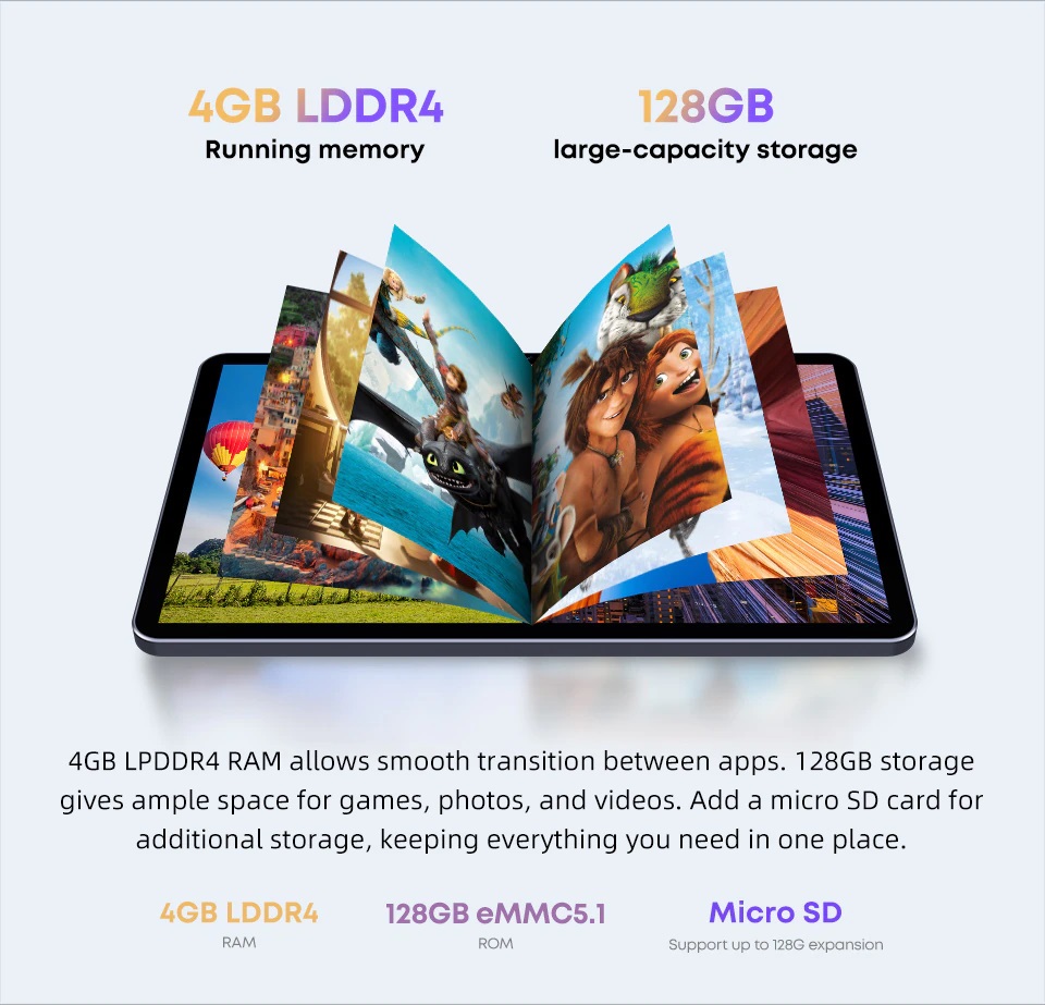 Với ram 4GB LPDDR4 ổ cứng 128GB hỗ trợ thẻ nhớ lên đến 128GB. Cấu hình này giúp chiếc Hipad Air có thể chạy đa nhiệm khá tốt và thoải mái lưu trữ dữ liệu.