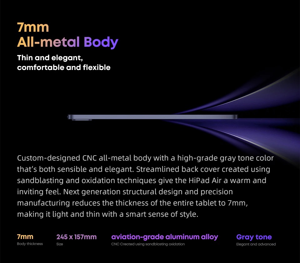 Thiết kế của chiếc Hipad air bằng hợp kim nguyên khối, cạnh máy được gia công tương tự các dòng máy tính bảng Iphone mới nhất. Nắp lưng được sắp xếp hợp lý được tạo ra bằng kỹ thuật phun cát và oxy hóa mang lại cho HiPad Air một cảm giác ấm áp và hấp dẫn. Độ dày của tablet chỉ còn 7mm.