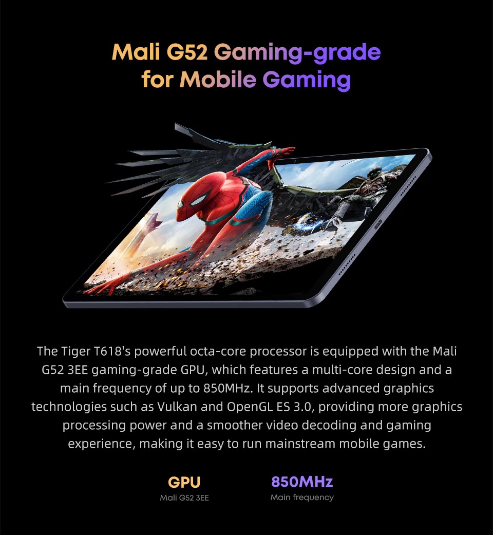 Bộ vi xử lý tám lõi mạnh mẽ của Tiger T618 được trang bị GPU Mali G52 3EE, có thiết kế đa lõi và tần số chính lên đến 850MHz. Nó hỗ trợ các công nghệ đồ họa tiên tiến như Vulkan và OpenGL ES 3.0, cung cấp thêm sức mạnh xử lý đồ họa và trải nghiệm video và chơi game mượt mà hơn, giúp bạn dễ dàng chạy các game di động phổ thông.