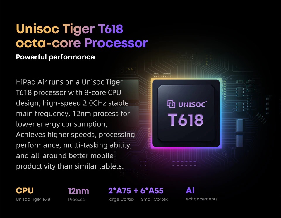 HiPad Air chạy trên bộ vi xử lý Unisoc Tiger T618 với thiết kế CPU 8 nhân, tốc độ  2.0GHz. Chip T618 được gia công trên tiến trình 12nm giúp tiết kiệm điện nhưng khả năng sử lý đa nhiệm vẫn cực tốt.