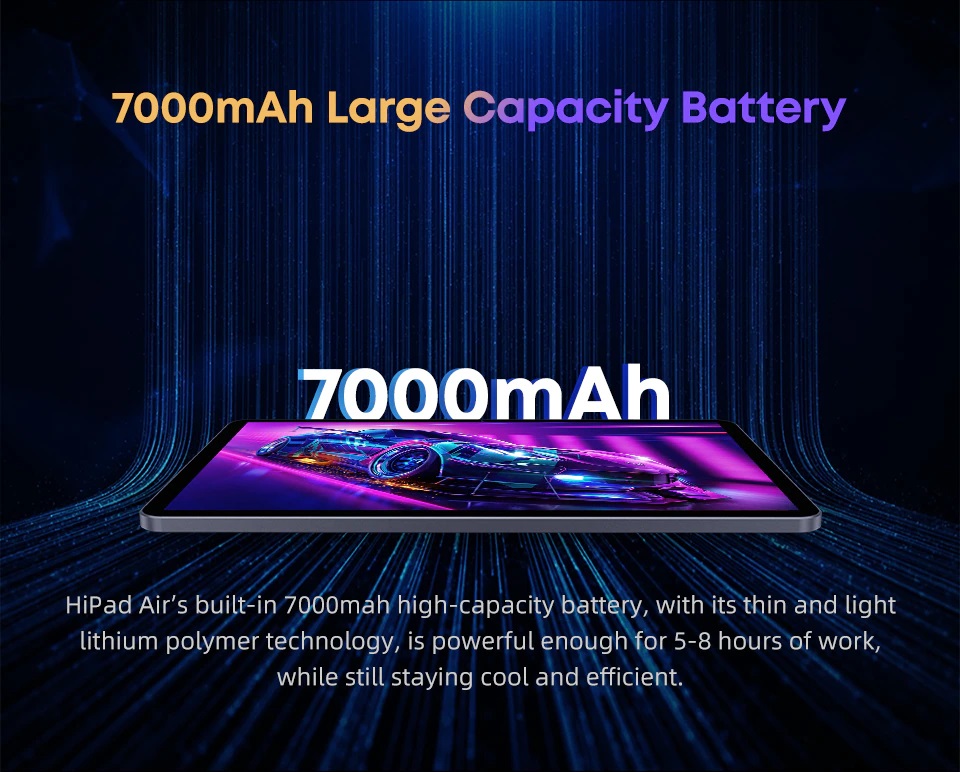 Với viên pin 7000 mAh bên trong chiếc Hipad Air giúp nó có thể hoạt động liên tục đến 8H