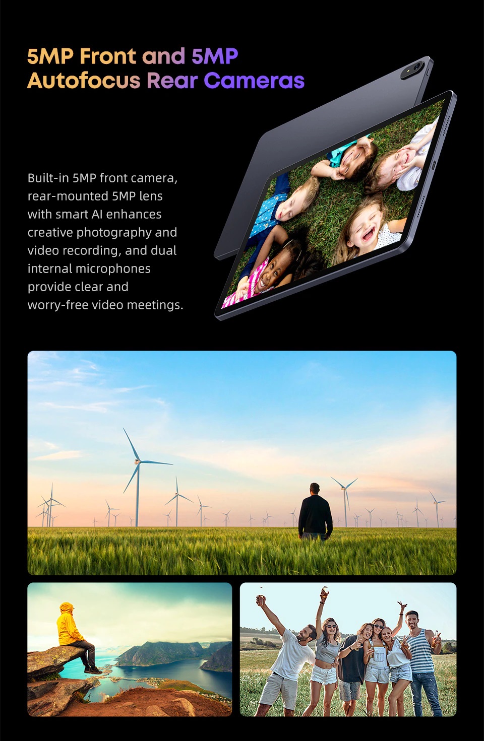 Camera trước 5MP tích hợp hỗ trợ nhận dạng khuôn mặt Face ID để mở khóa máy tính bảng và bảo vệ dữ liệu riêng tư. Ống kính 5MP gắn phía sau với AI thông minh giúp tăng cường khả năng chụp ảnh và quay video sáng tạo, đồng thời micrô kép bên trong cung cấp các cuộc họp video rõ ràng và không lo lắng.