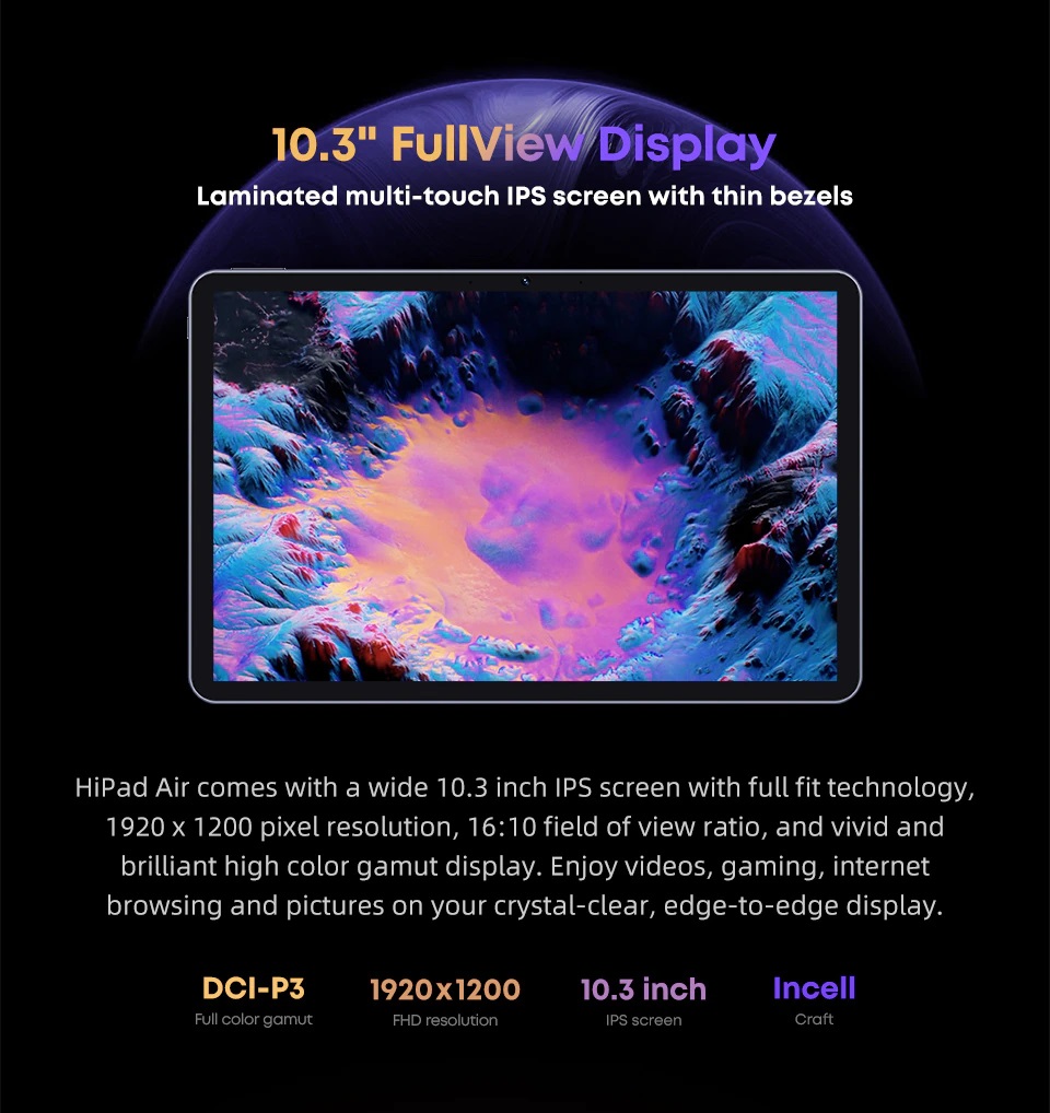 Chiếc Hipad Air được trang bị màn hình IPS 10,3 inch độ phân giản 1920*1200 với tỷ lệ 16:10. Với thiết kế viền màn hình khá mỏng giúp chiếc tablet nhìn rất trẻ trung năng động.