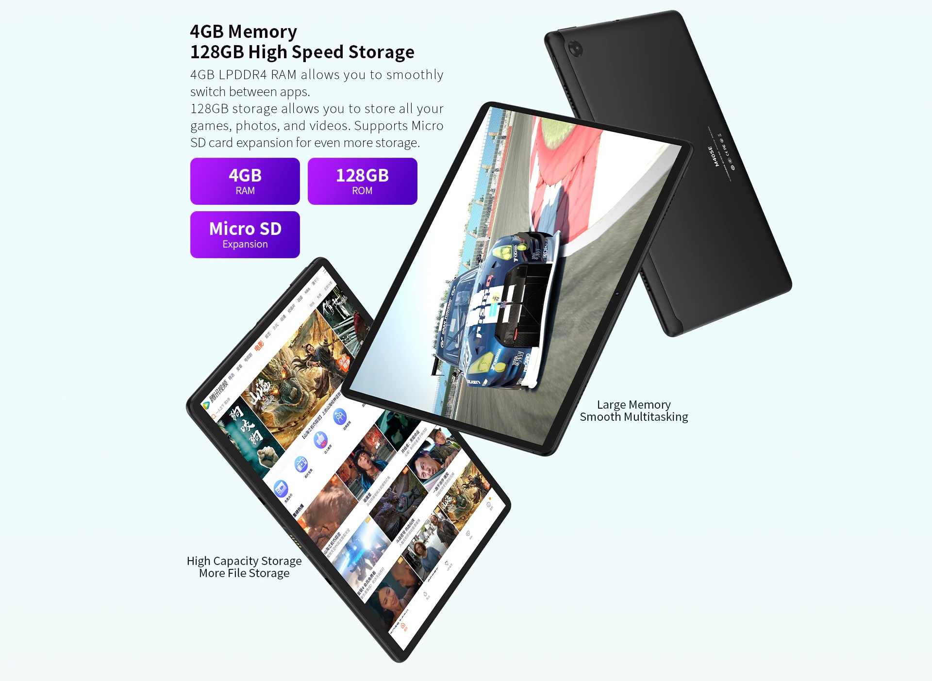 Được trang bị ram 4GB LPDDR4 tốc độ cao đi kèm với ổ cứng 128GB giúp chiếc tablet có thể chạy đa ứng dụng và thoại mái lữu trữ, nó cũng hỗ trợ thẻ nhớ Micro SD để bạn dễ dàng nâng cấp khả năng lưu trữ của máy.