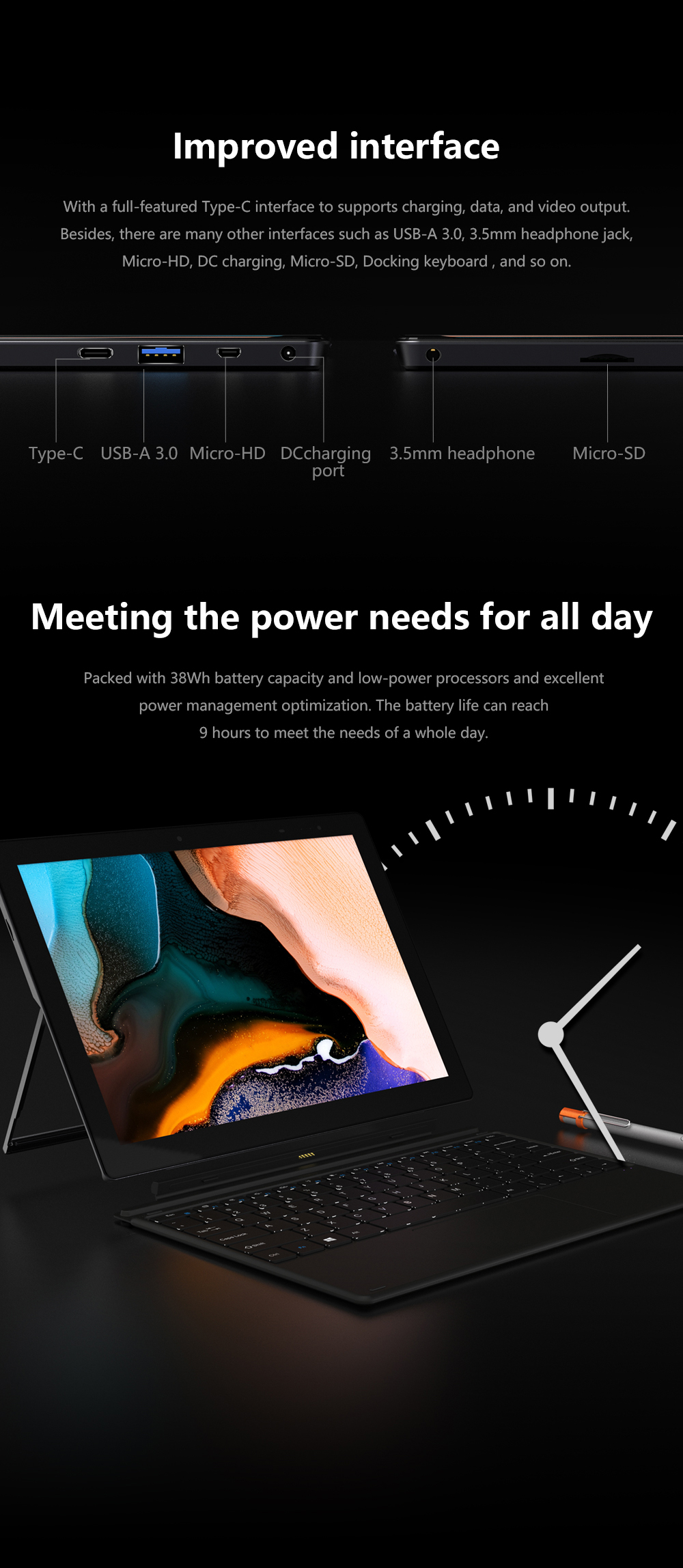 Với dung lượng pin 38Wh kết hợp với chíp có mức tiêu thụ điện năng thấp kết hợp với phần mềm quản lý điện năng cực tốt khiến thời lượng pin có thể đạt 9 giờ.