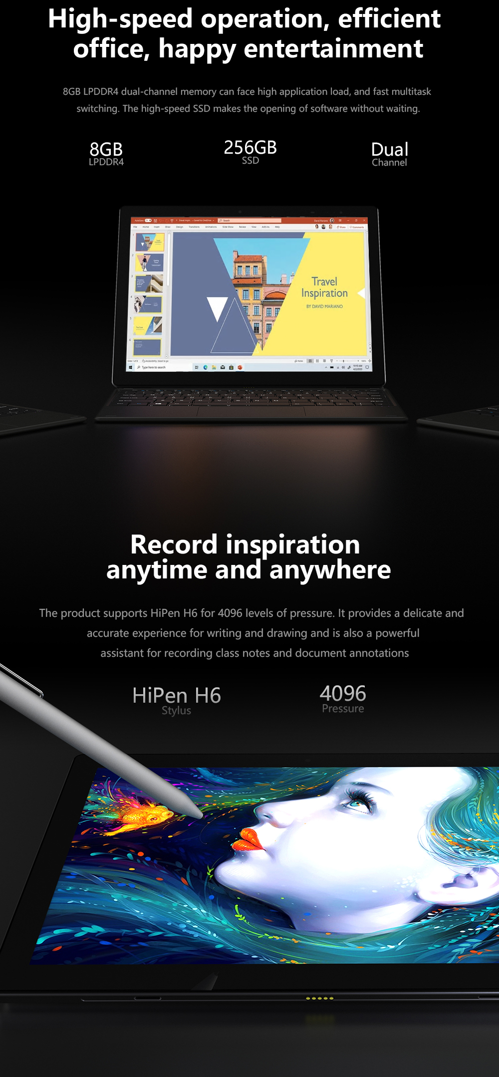 Ubook X được thiết kế với thanh ram lên đến 8GB LPDDR4 hai luồng giúp chiếc máy tính sử lý đa nhiệm tốt hơn, kèm theo là ổ cứng SSD có tốc độ đọc và nghi sữ liệu cực nhanh giúp bạn mở ứng dụng chỉ trong chơp mắt. Ngoài ra chiếc Ubook X cũng hỗ trợ bút cảm ứng Pen H6 với mức nhận lực 4096. Nó cung cấp trải nghiệm tinh tế và chính xác khi viết và vẽ, đồng thời cũng là một trợ thủ đắc lực để ghi lại các ghi chú và chú thích tài liệu.