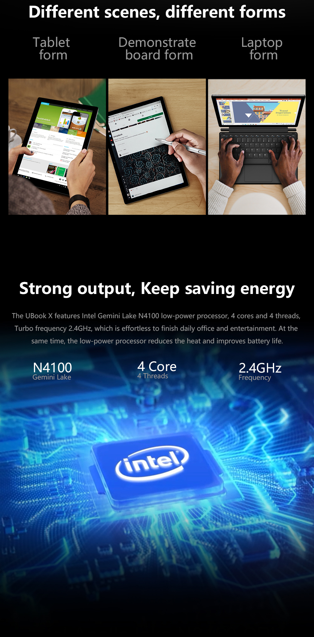UBook X trang bị bộ vi xử lý Intel Gemini Lake N4100, 4 lõi và 4 luồng, tần số Turbo 2.4GHz, giúp bạn dễ dàng hoàn thành công việc văn phòng và giải trí hàng ngày nhưng chơi game lướt web hay xem phim trực tuyến. Bộ xử lý thệ hệ mới có mức tiêu thụ điện năng thấp giúp thời lượng sử dụng pin dài hơn.