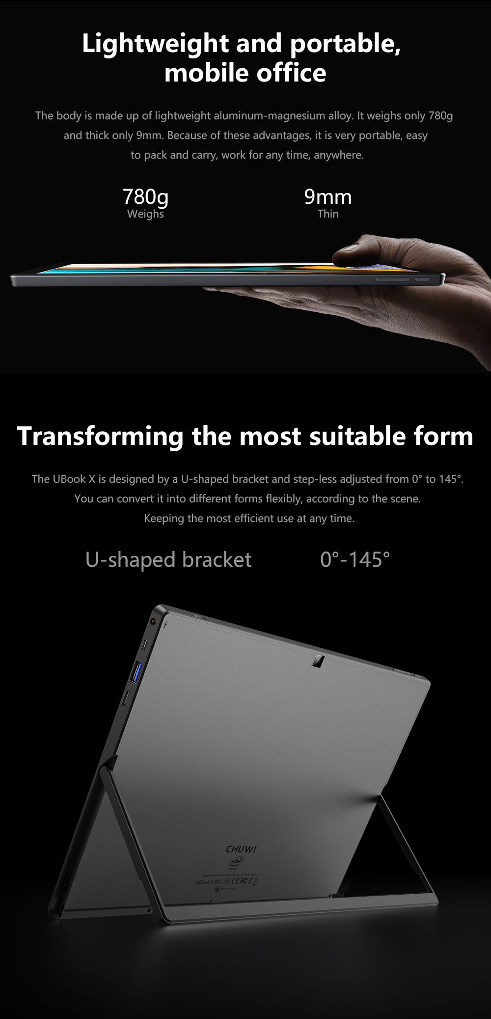 Thân của chiếc ubook X được làm bằng hợp kim nhôm-magiê, chỉ nặng 780g và dày chỉ 9mm. Thiết trẻ trung năng động, bạn có thể mang theo chiếc máy tính của mình đi mọi nơi mà không cảm thấy khó chịu.