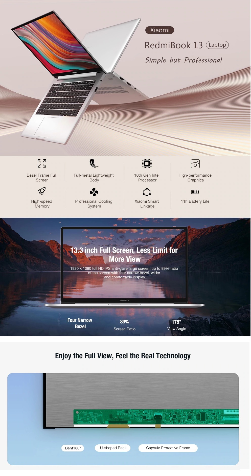 Đúng như tên gọi màn hình của chiếc redmibook 13 có kích thước 13.3 inch IPSđộ phân giải FHD. Màn hình của chiếc Redmibook 14 chiếm đến 89% diện tích của mặt trước, để làm được điều này hãng xiaomi đã thiết kế viền màn hình của chiếc Redmibook 13 siêu mỏng.
