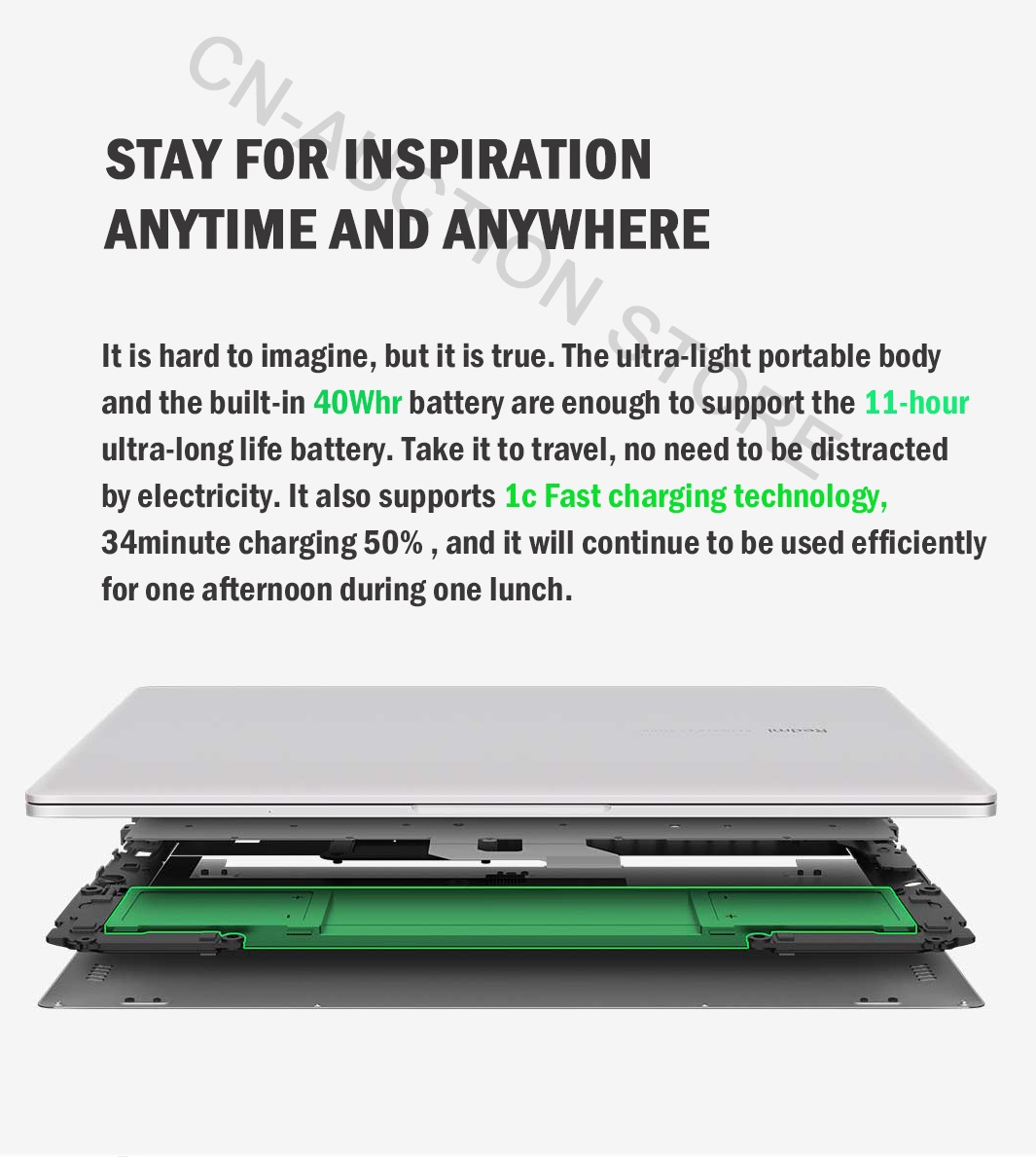 Xiaomi Redmibook 13 sở hữu viên pin khủng lên đến 40Whr cho phép máy hoạt động trong 11h (theo nhà sản xuất), Chiếc Redmibook 13 cũng được tích hợp công nghệ sạc nhanh 1C sạc 50% pin chỉ trong vòng 34 phút.