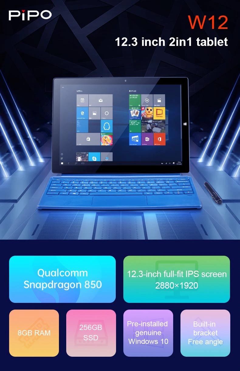 Chip Qualcomm Snapdragon 850 trang bị cho chiếc Pipo W12 được Qualcomm phát triển để chạy trên các dòng PC chạy windows nhưng có tính năng kết nối mạng 4G và thời lượng pin dài hơn. Chip Snapdragon 850 mới được trang bị CPU Kryo 2.95GHz được tối ưu hóa cho PC. Nó giúp Snapdragon 850 PC có hiệu năng hơn 30% (bao gồm đồ họa), tuổi thọ pin cao hơn 20% và tốc độ LTE gigabit nhanh hơn 20% so với Snapdragon 835.
