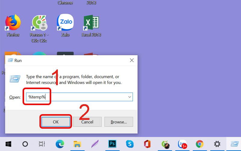 - Bước 1: Mở hộp thư thoại Run (Windows+R), nhập lệnh %temp% > Nhấn OK.
