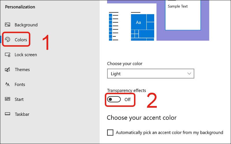Tắt hiệu ứng đồ họa, biểu tượng trong suốt: