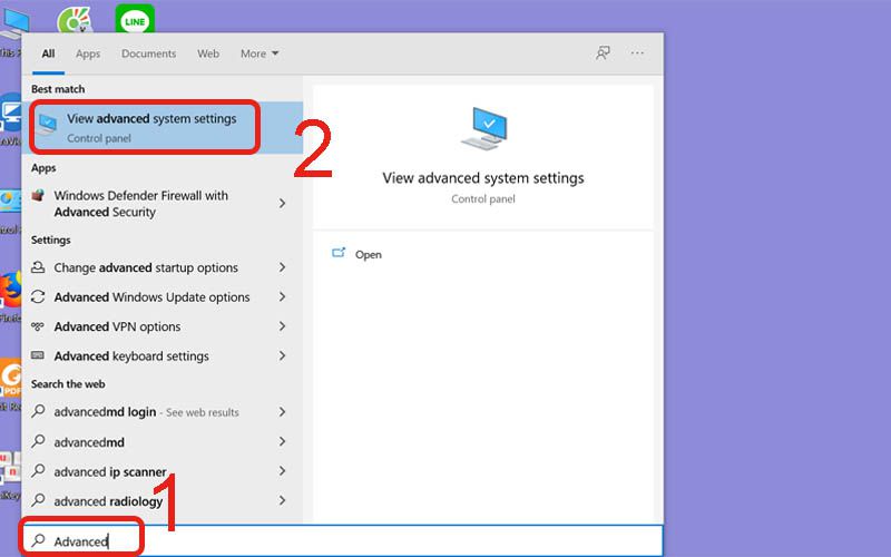 - Bước 1: Nhập Advanced trong thanh tìm kiếm Windows > Chọn View advanced system settings.