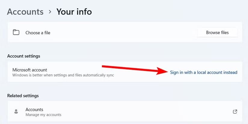 Khi cài đặt Windows, Microsoft đã làm cho việc bỏ qua quá trình tạo tài khoản Microsoft trở nên khó khăn. Nếu bạn nhượng bộ và tạo một tài khoản để chuyển quá trình cài đặt Windows sang một bên, nhưng bạn không cần nó, bạn có thể dễ dàng vô hiệu hóa nó. Điều này sẽ khiến bạn sử dụng một tài khoản cục bộ trên Windows .Để thực hiện điều đó, hãy nhấn Win+i để mở ứng dụng cài đặt và đi tới Accounts > Your info. Trong phần Cài đặt tài khoản, hãy nhấp vào liên kết “Sign in with a local account instead”.