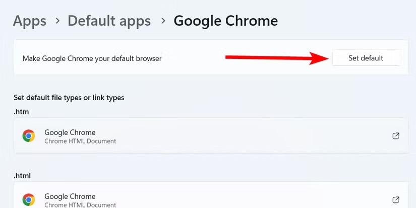 Microsoft đang tích cực thúc đẩy bạn sử dụng Microsoft Edge. Vì vậy, theo lẽ tự nhiên, đây là trình duyệt mặc định trên máy tính Windows của bạn. Nhưng nếu bạn thích Chrome, Firefox hoặc bất kỳ trình duyệt nào khác, bạn có thể dễ dàng thay đổi trình duyệt mặc định thành trình duyệt bạn sử dụng.Để thực hiện điều đó, hãy vào Settings > Apps > Default apps. Trong danh sách ứng dụng, hãy tìm và nhấp vào trình duyệt bạn muốn làm mặc định mới (ví dụ: Chrome, Firefox hoặc Brave). Cuối cùng, nhấp vào nút "Set Default".