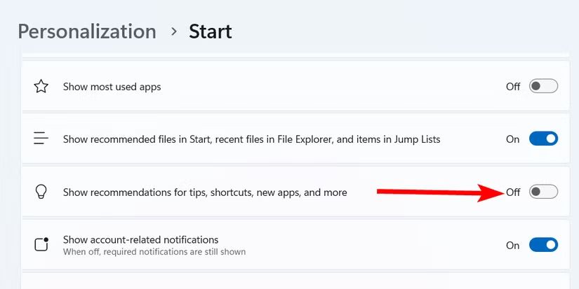 Windows 11 có thể hiển thị quảng cáo ở những nơi bạn không mong đợi, bao gồm Start Menu, Lock Screen và File Explorer. Những quảng cáo này khá phiền phức, nhưng bạn có thể dễ dàng tắt chúng chỉ bằng vài cú nhấp chuột.Để tắt quảng cáo trên Menu Bắt đầu (nội dung được đề xuất), hãy vào Settings > Personalization > Start and turn off chuyển "Show suggestions for tips, shortcuts, new apps, and more".